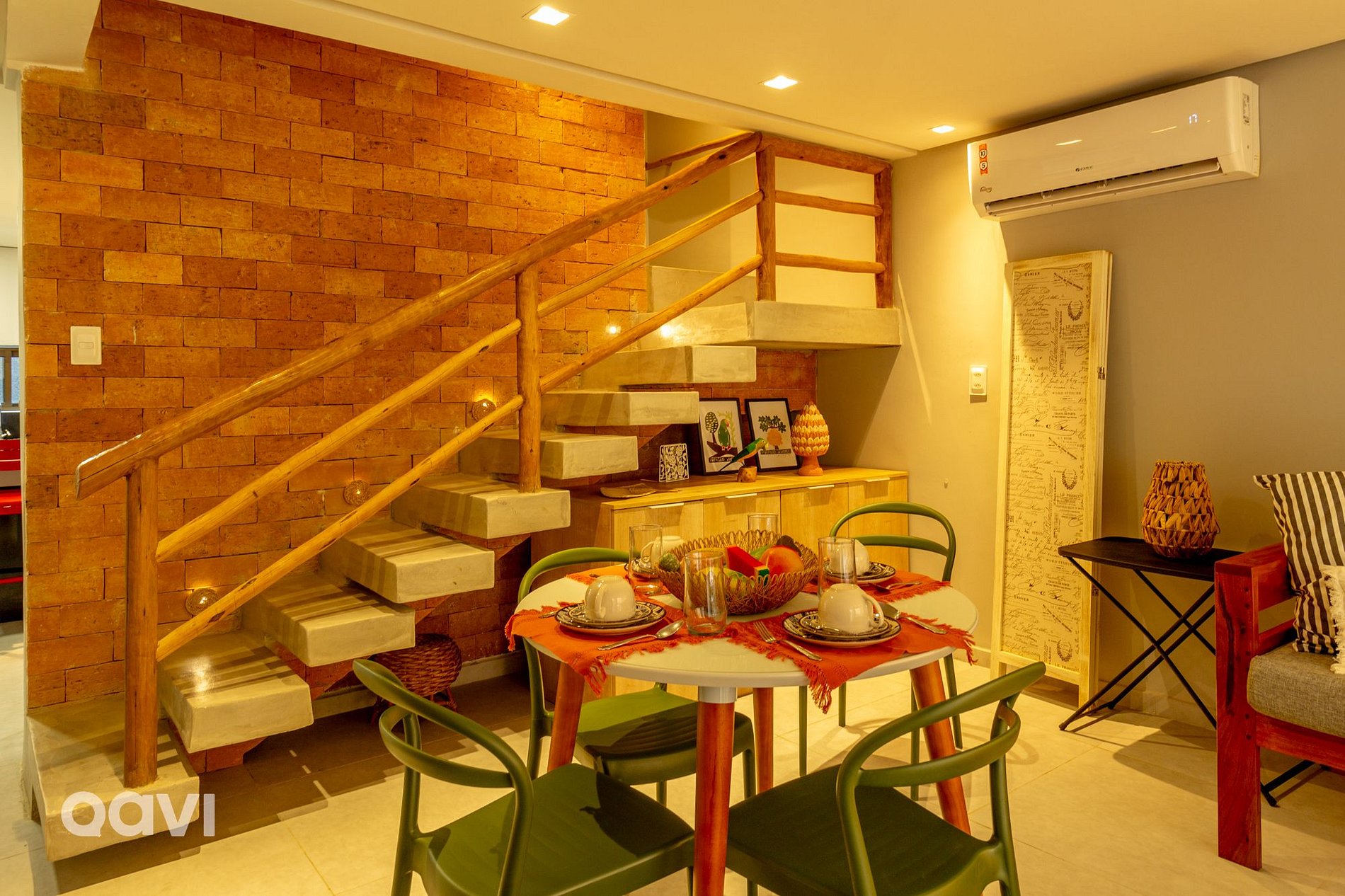 • Sala de estar: sofá, mesa para 4 pessoas, aparador, Smart TV e ar-condicionado;