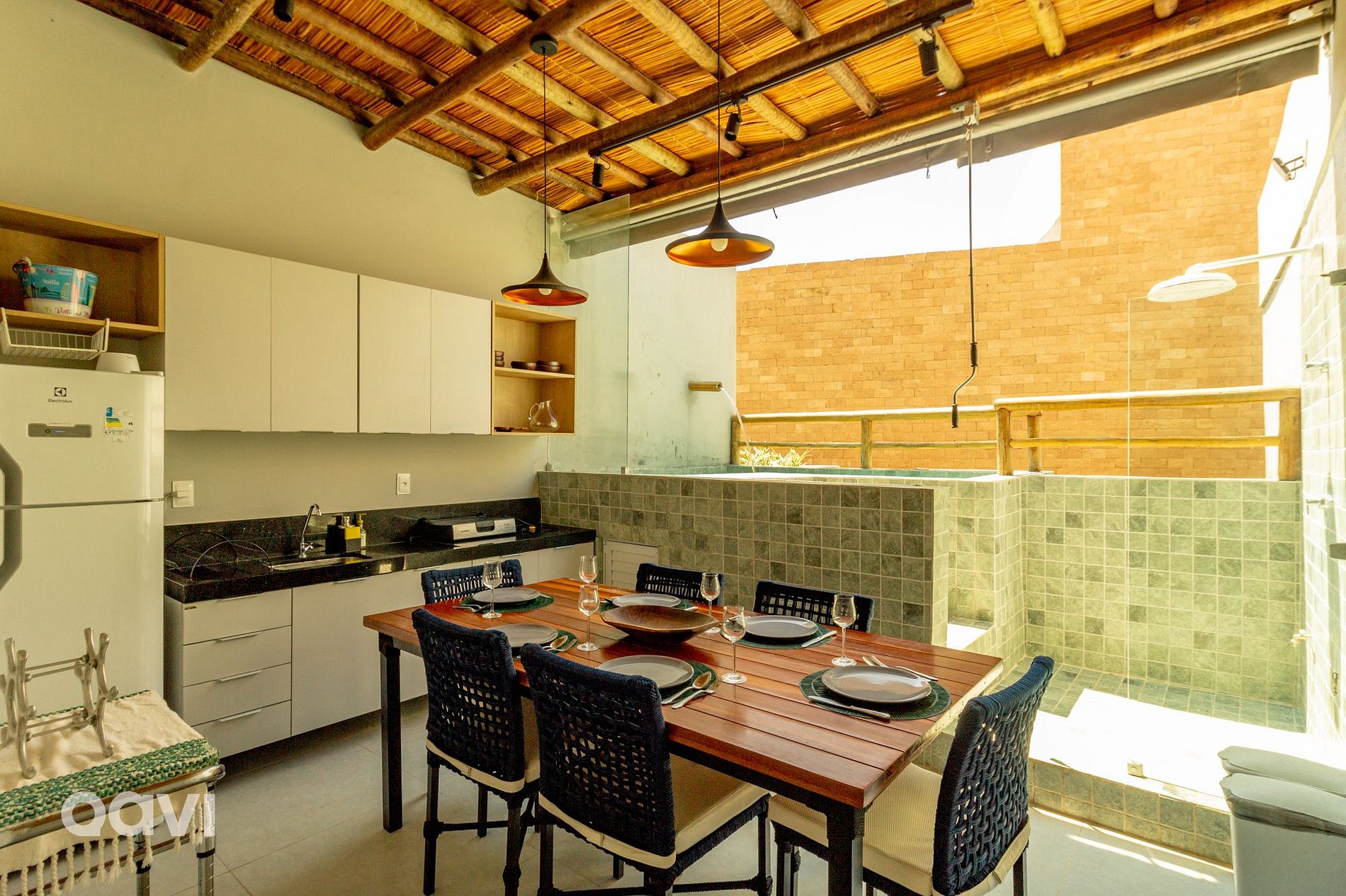 • Cobertura/Área gourmet: geladeira, grill elétrico, mesa para 6 pessoas, cooler, utensílios (pratos, copos e talheres), piscina privativa e chuveirão.