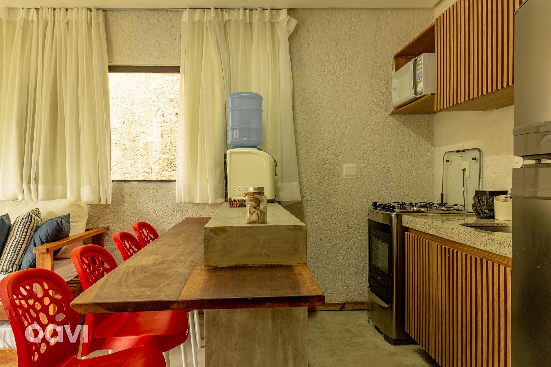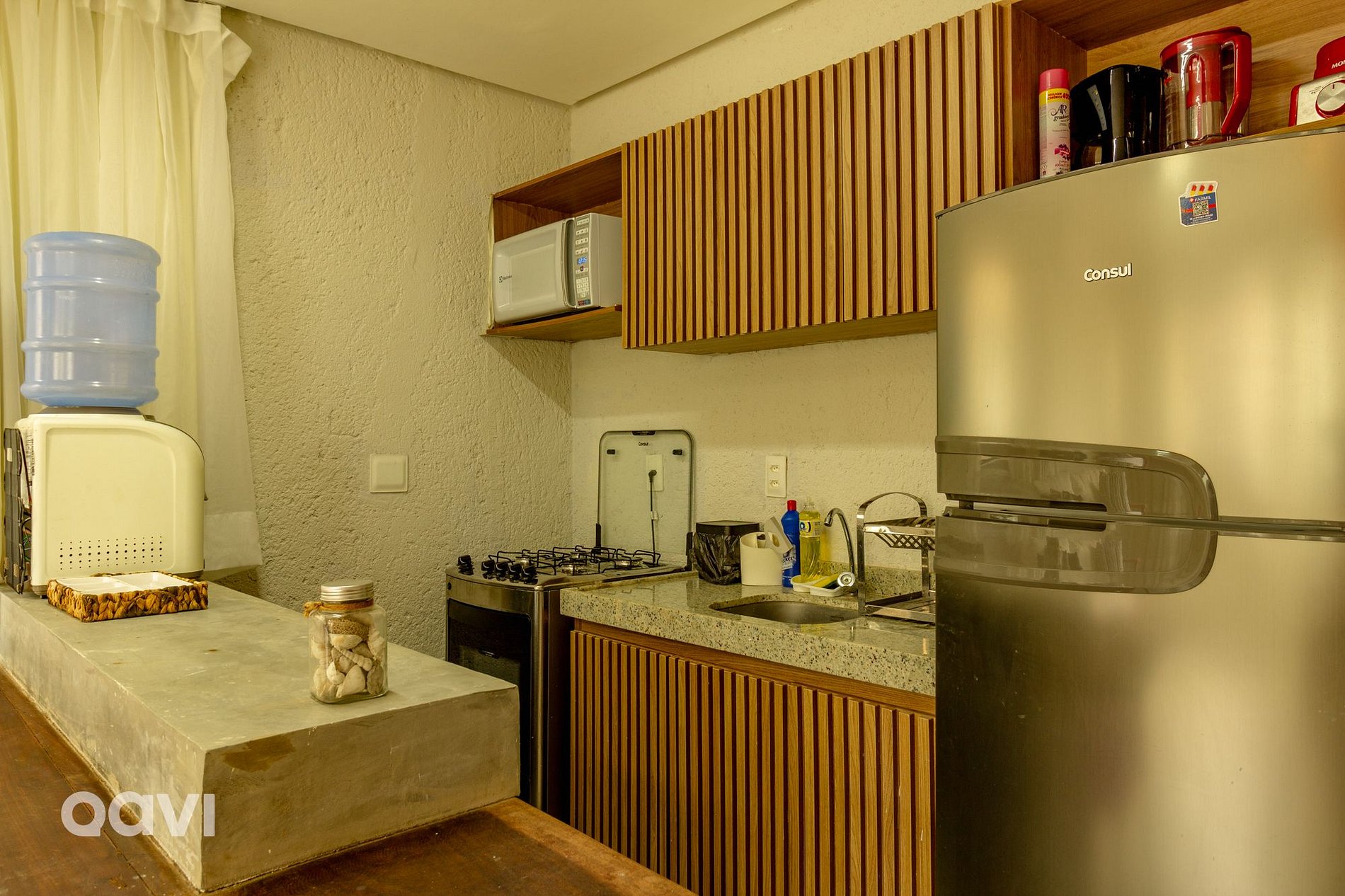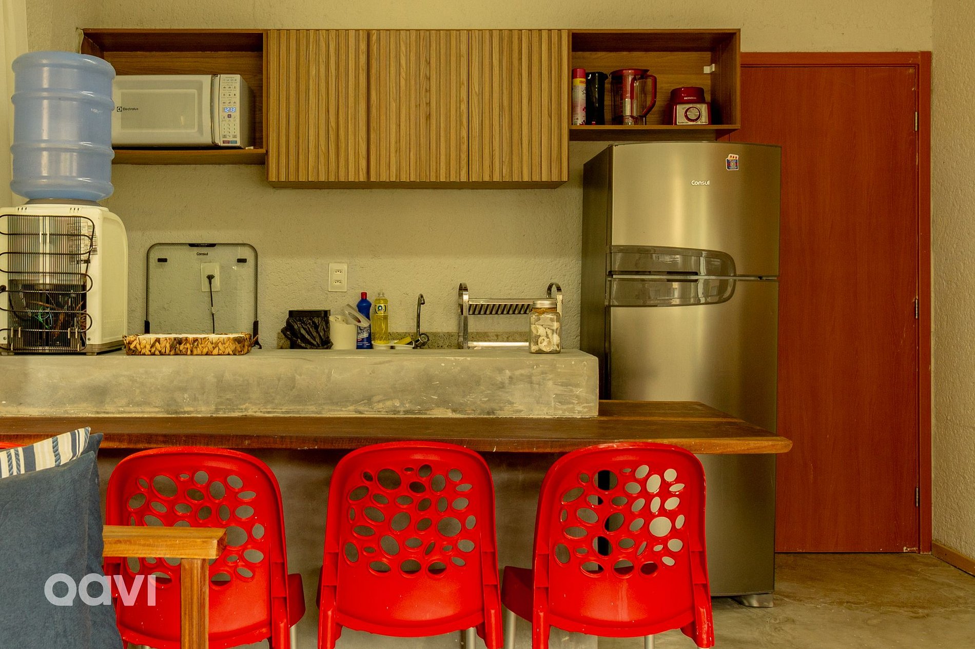 • Cozinha: utensílios completos (talheres, xícaras, panelas, pratos e copos), geladeira, cafeteira, sanduicheira, liquidificador, aparelhos de servir e armários.