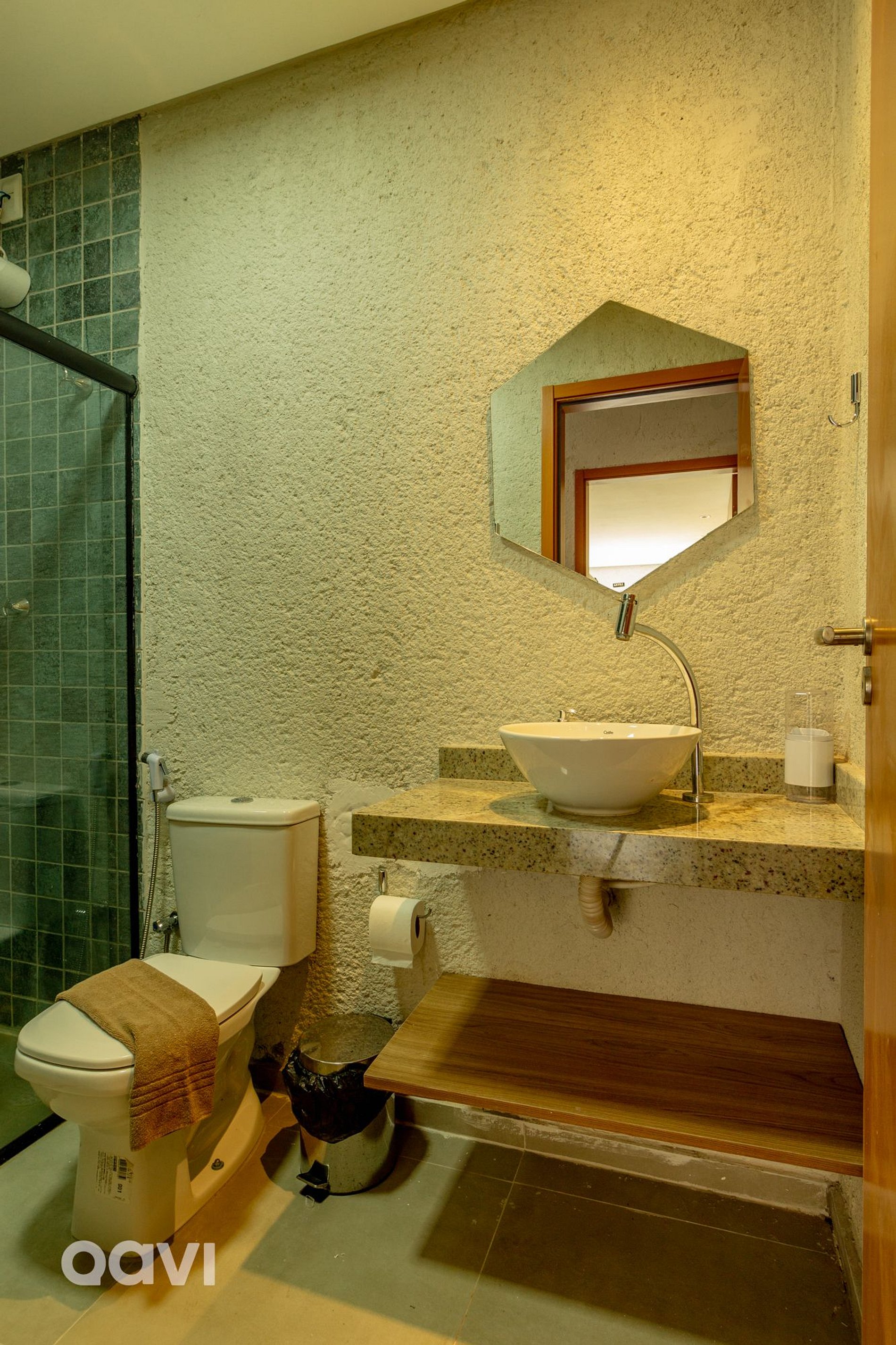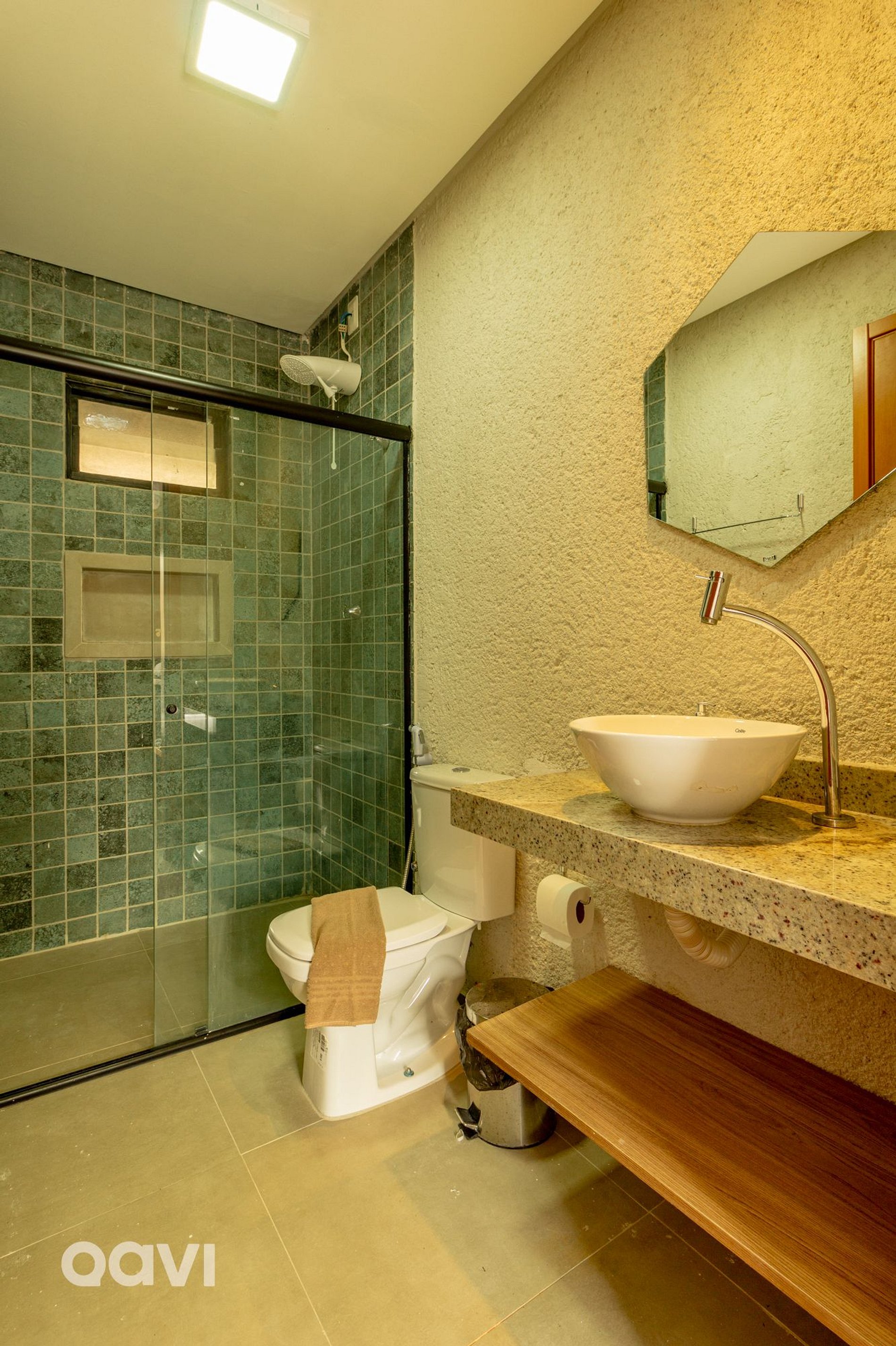 • Suíte 1: cama de casal, ar-condicionado, aparelhos decorativos e banheiro com utensílios básicos;