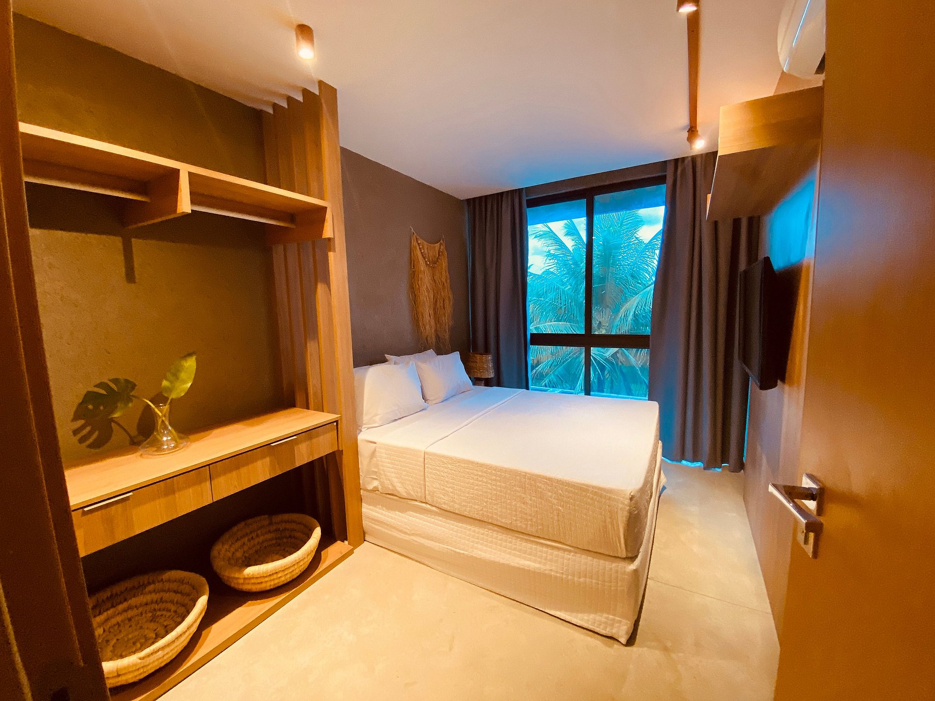 • Suíte principal: cama de casal, ar-condicionado, televisão smart tv, espelho de corpo inteiro, aparelhos decorativos e banheiro com utensílios básicos;