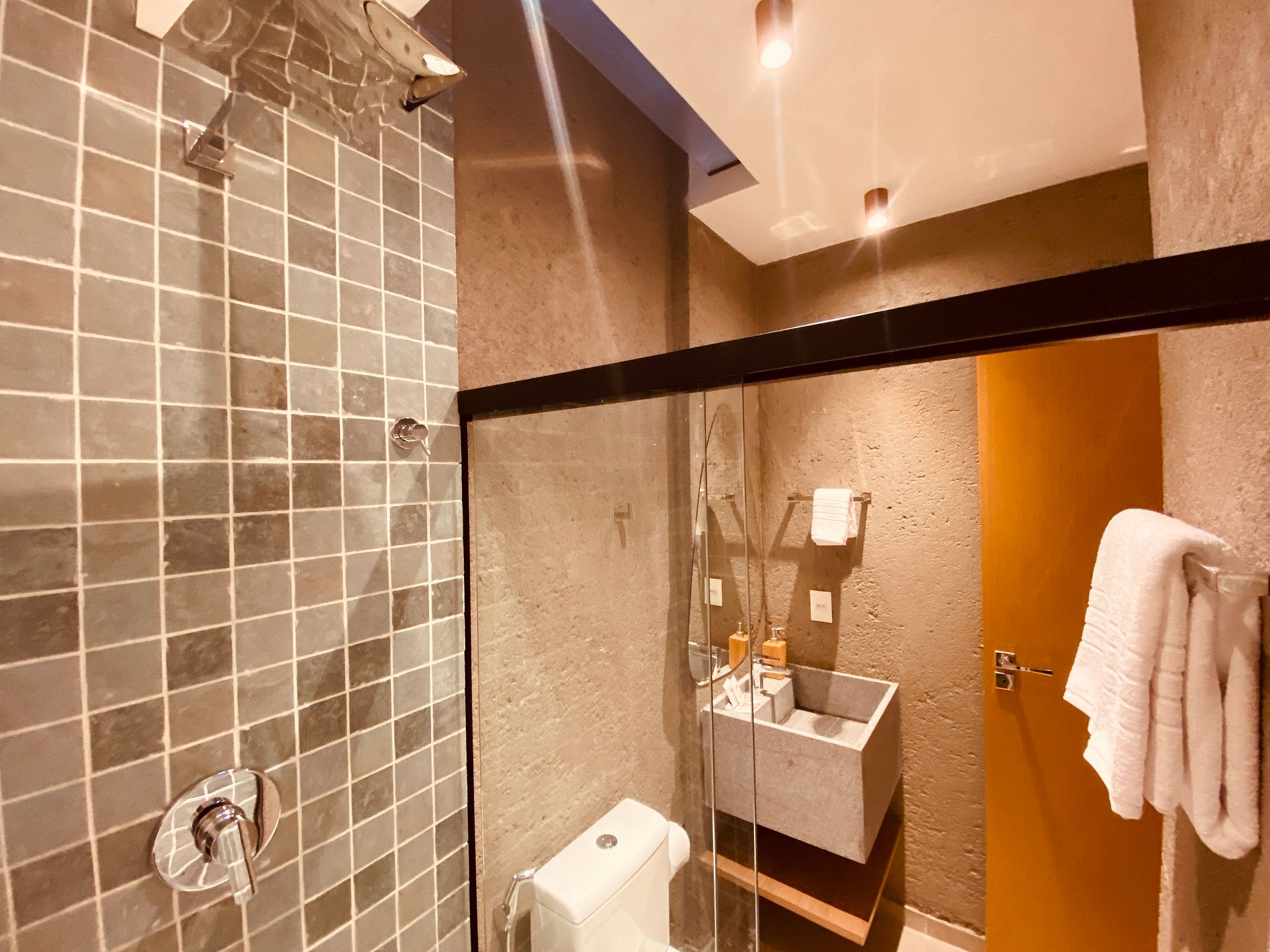 • Suíte principal: cama de casal, ar-condicionado, televisão smart tv, espelho de corpo inteiro, aparelhos decorativos e banheiro com utensílios básicos;