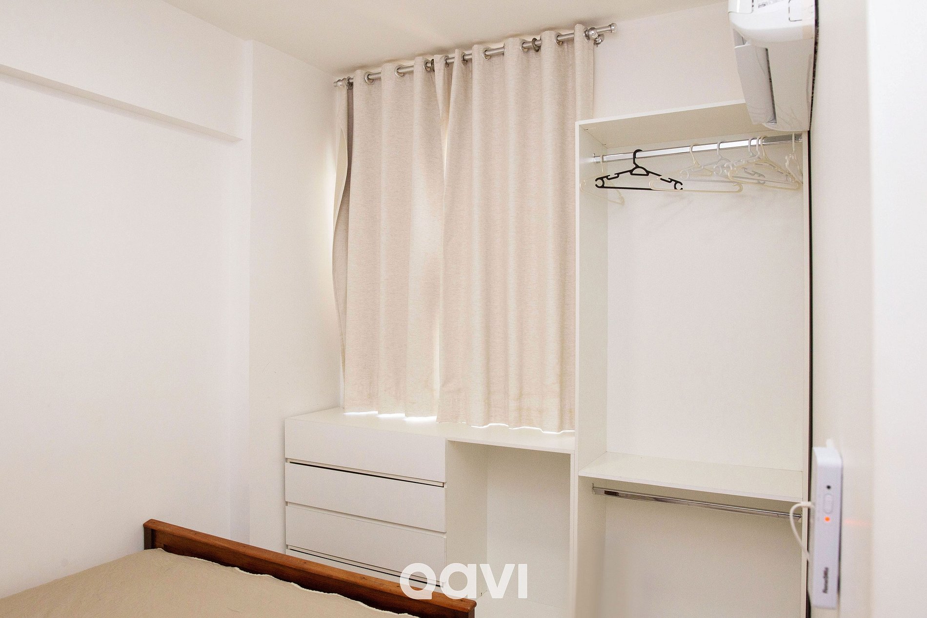 - Um quarto com duas camas box de solteiro, armários e gavetas embutidos.