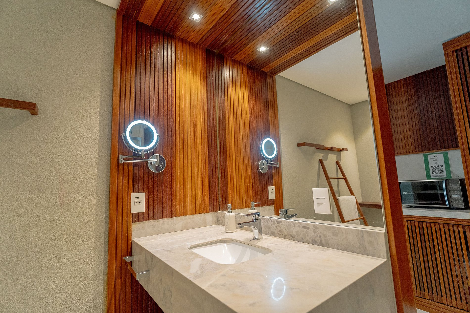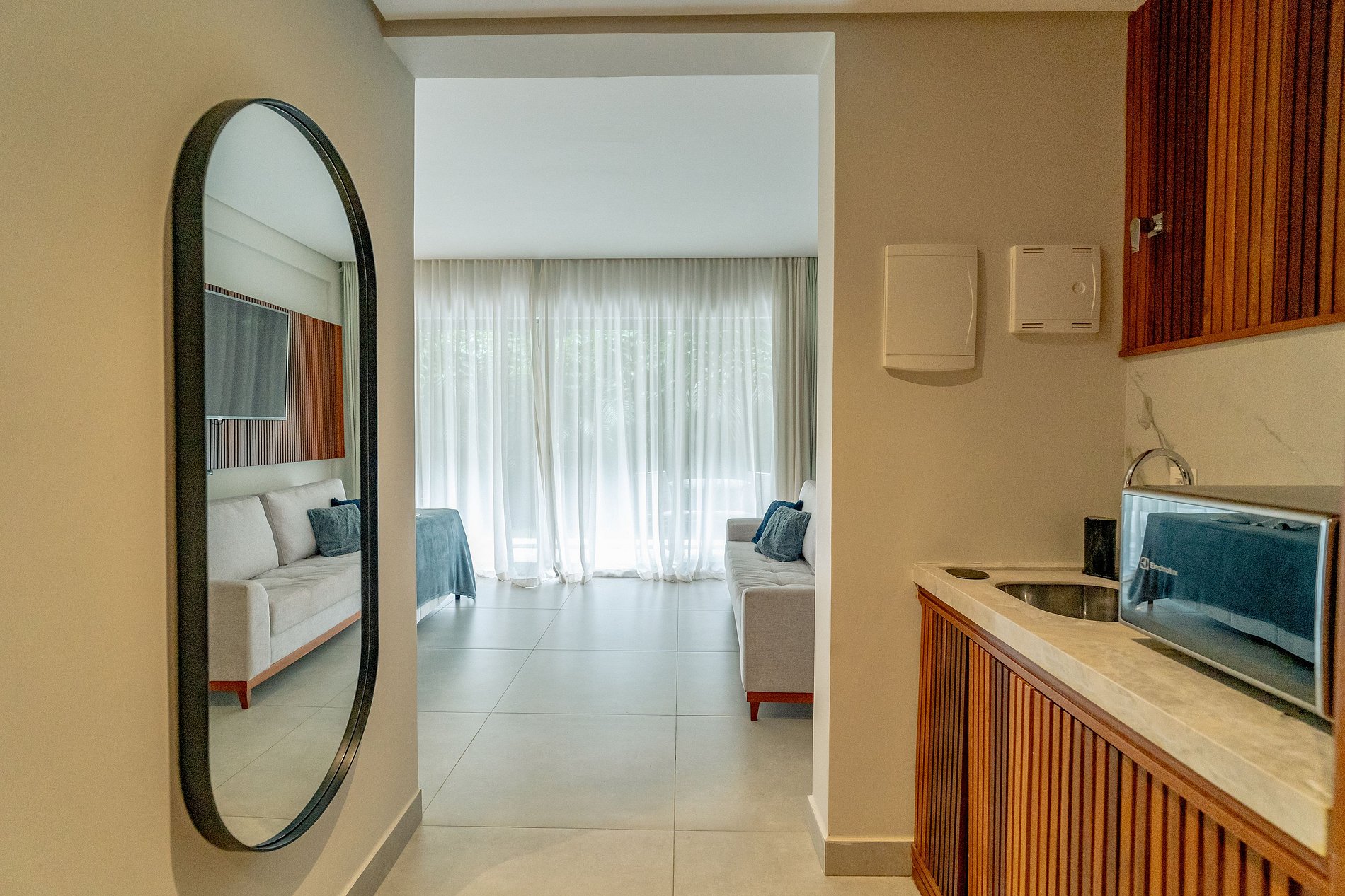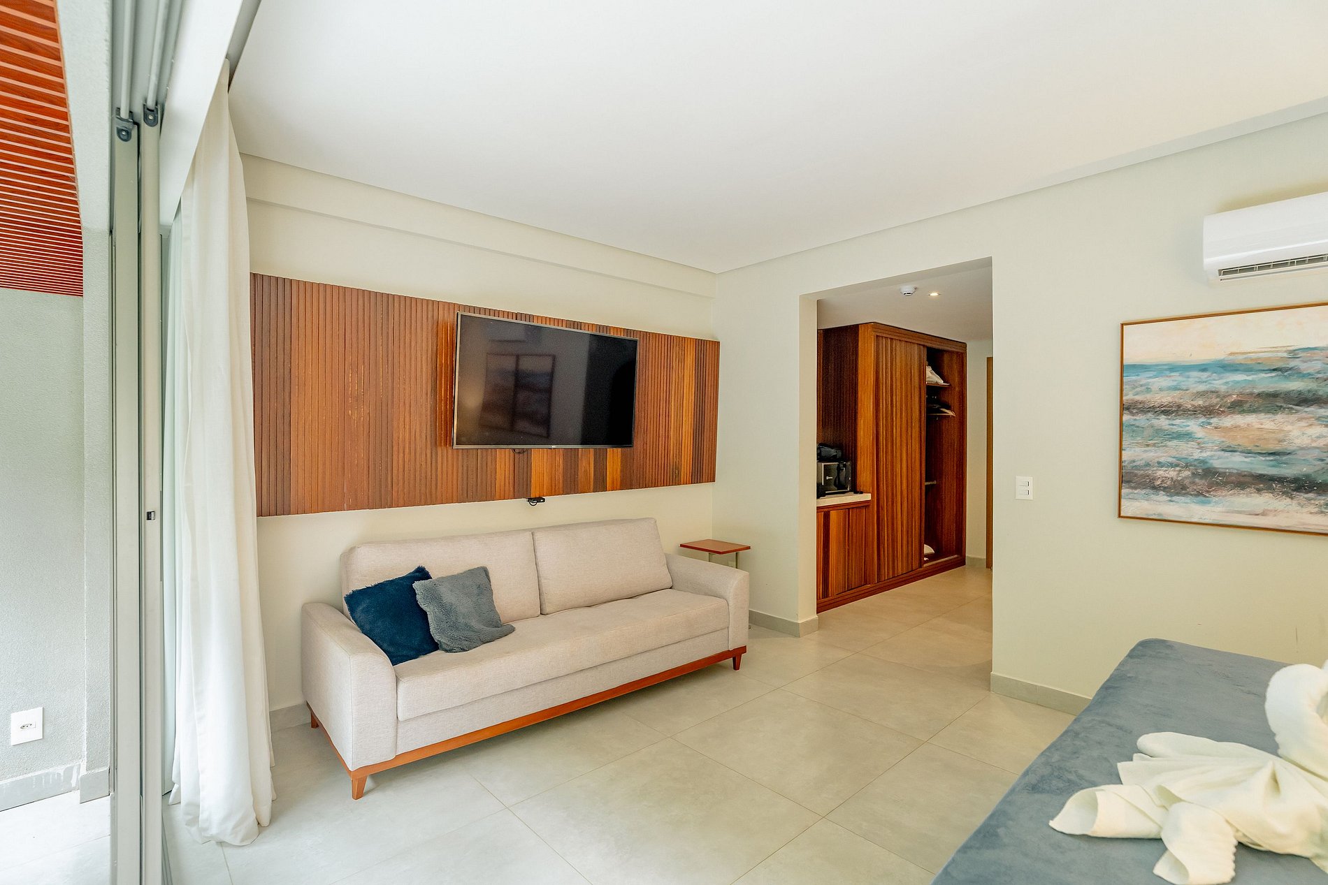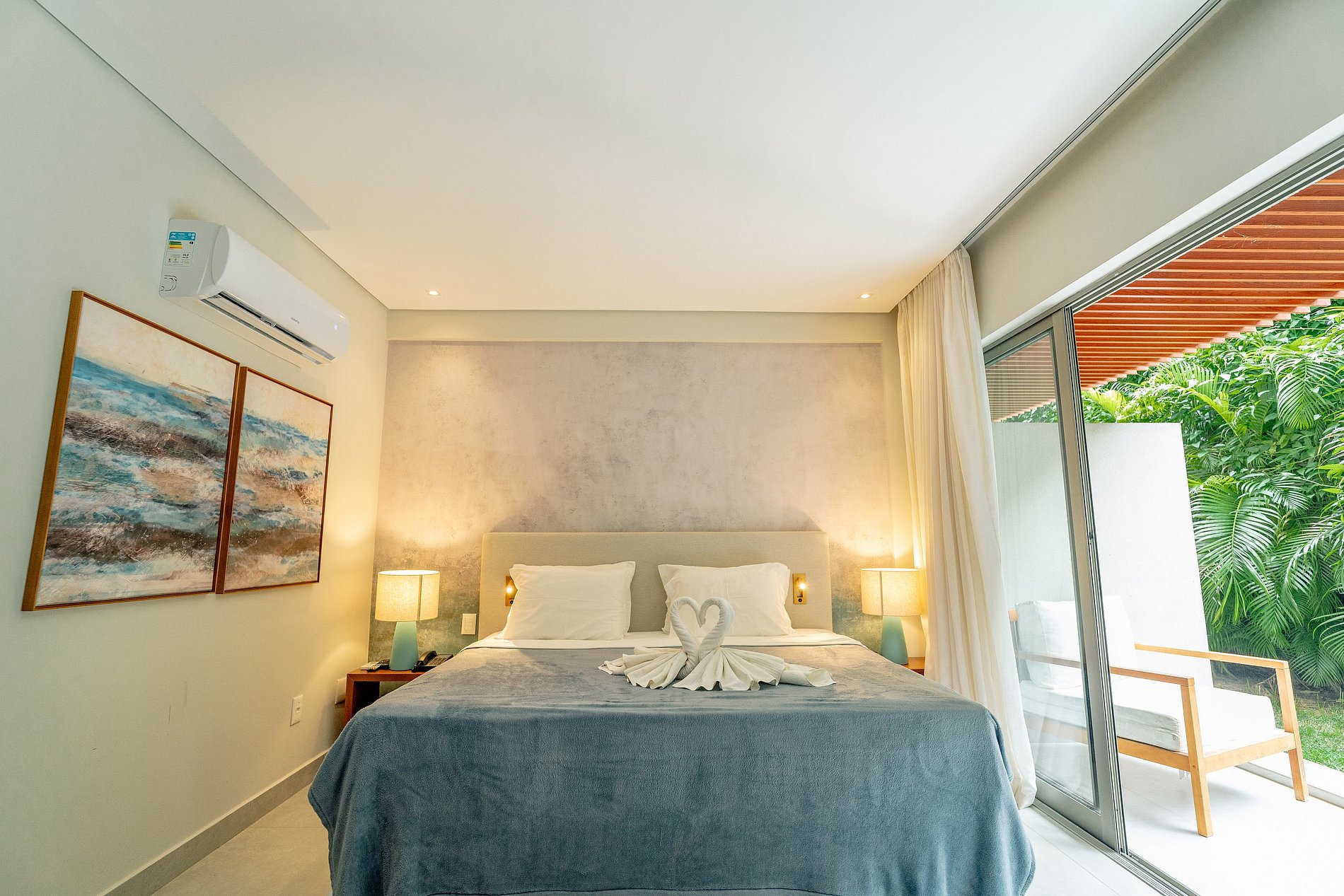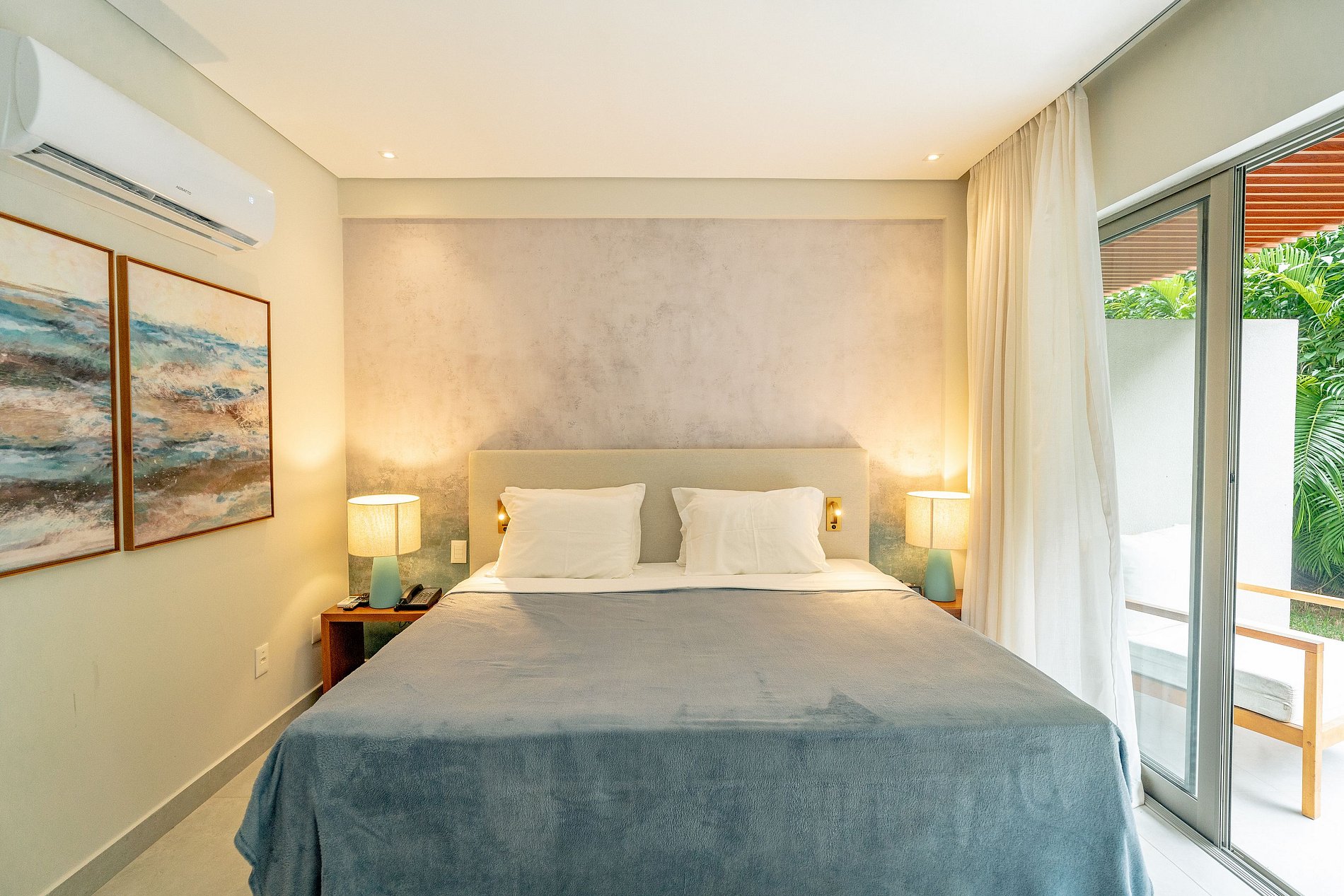 - Quarto: 1 cama de casal, 1 sofá-cama casal, Smart TV, mesas de cabeceira, cofre eletrônico, ar-condicionado e suporte de malas.