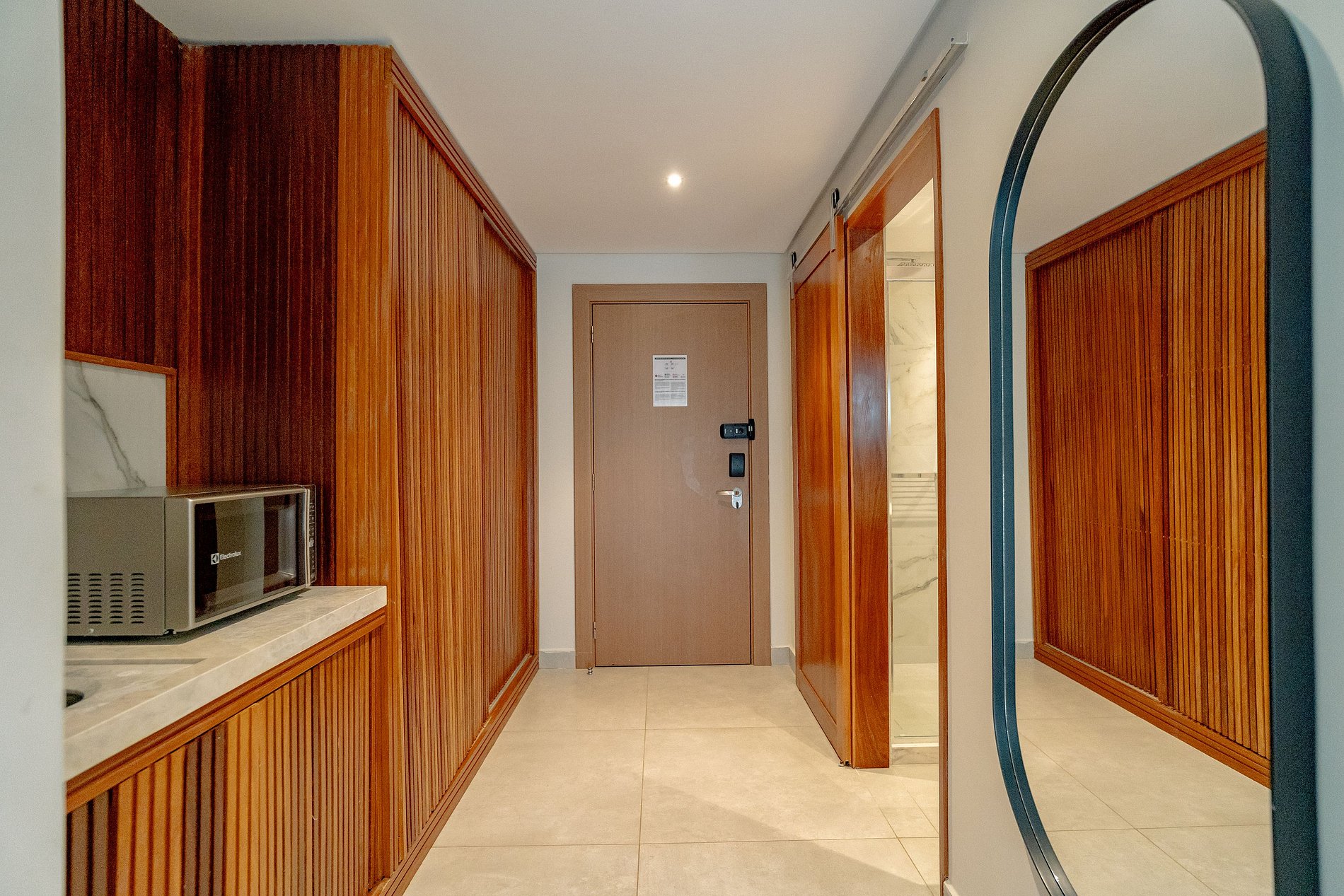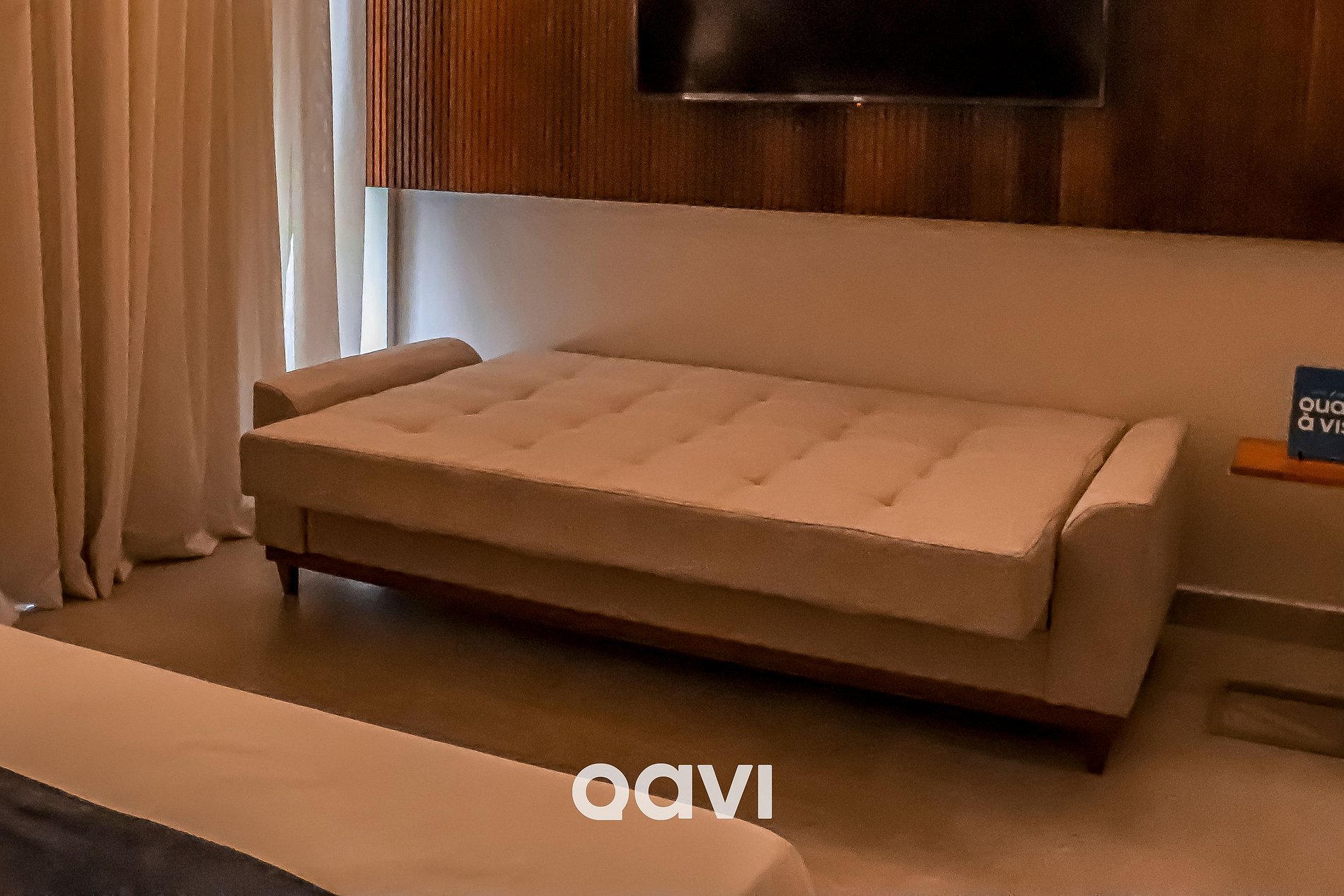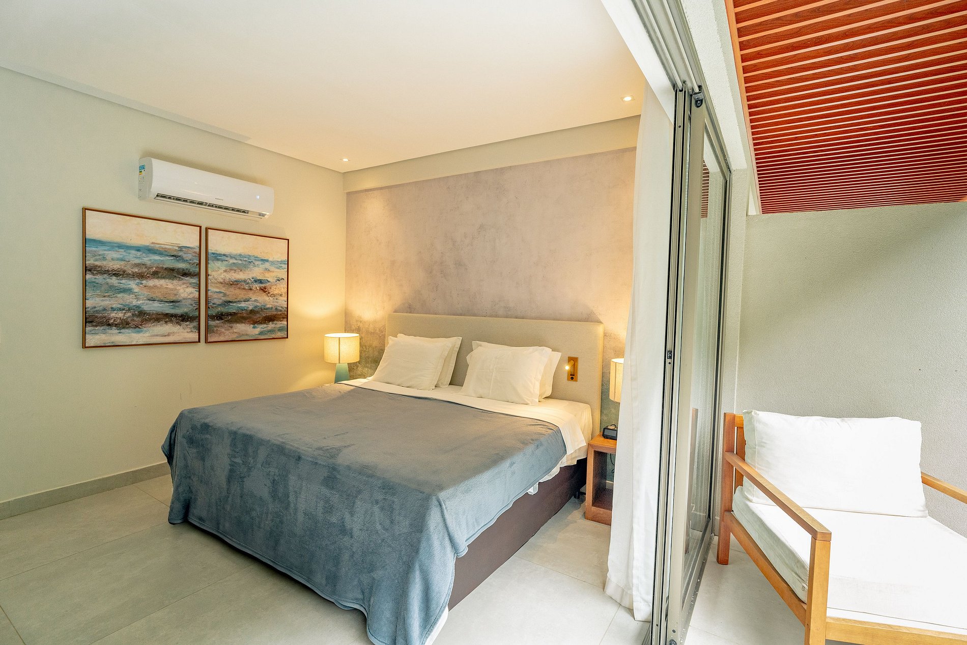 - Quarto: 1 cama de casal, 1 sofá-cama casal, Smart TV, mesas de cabeceira, cofre eletrônico, ar-condicionado e suporte de malas.