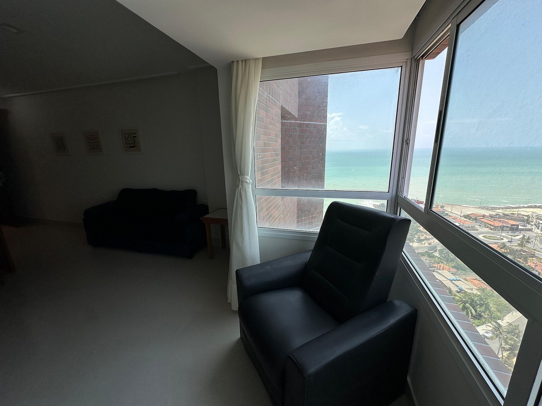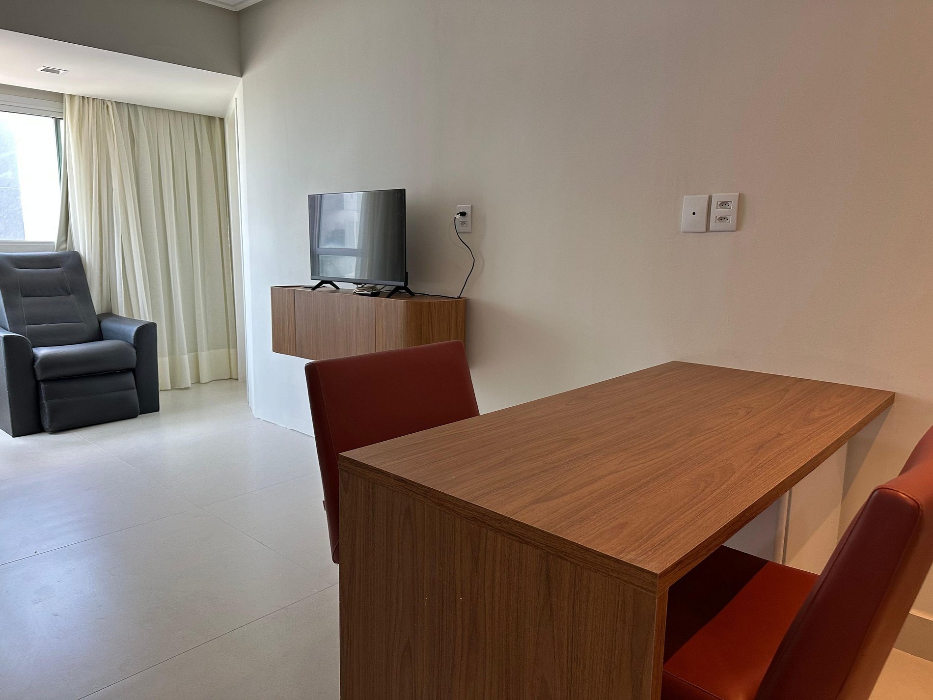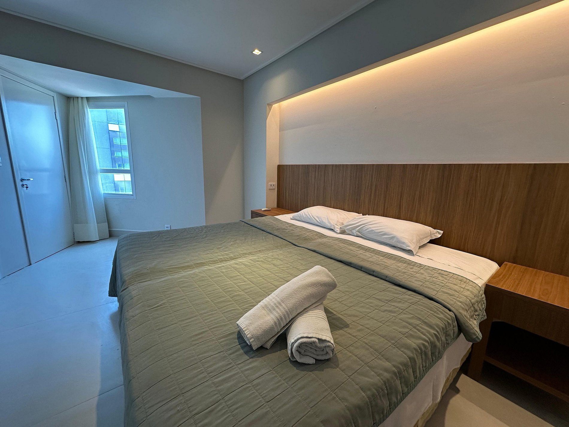 O quarto, com vista lateral para o mar, possui: cama de casal, sofá cama, frigobar, poltrona relaxante, cozinha compacta com mesa de apoio, 2 cadeiras, Wi-Fi, mesas de cabeceira, armário e cabides, ar-condicionado, banheiro com chuveiro quente e secador, Smart TV e interfone.