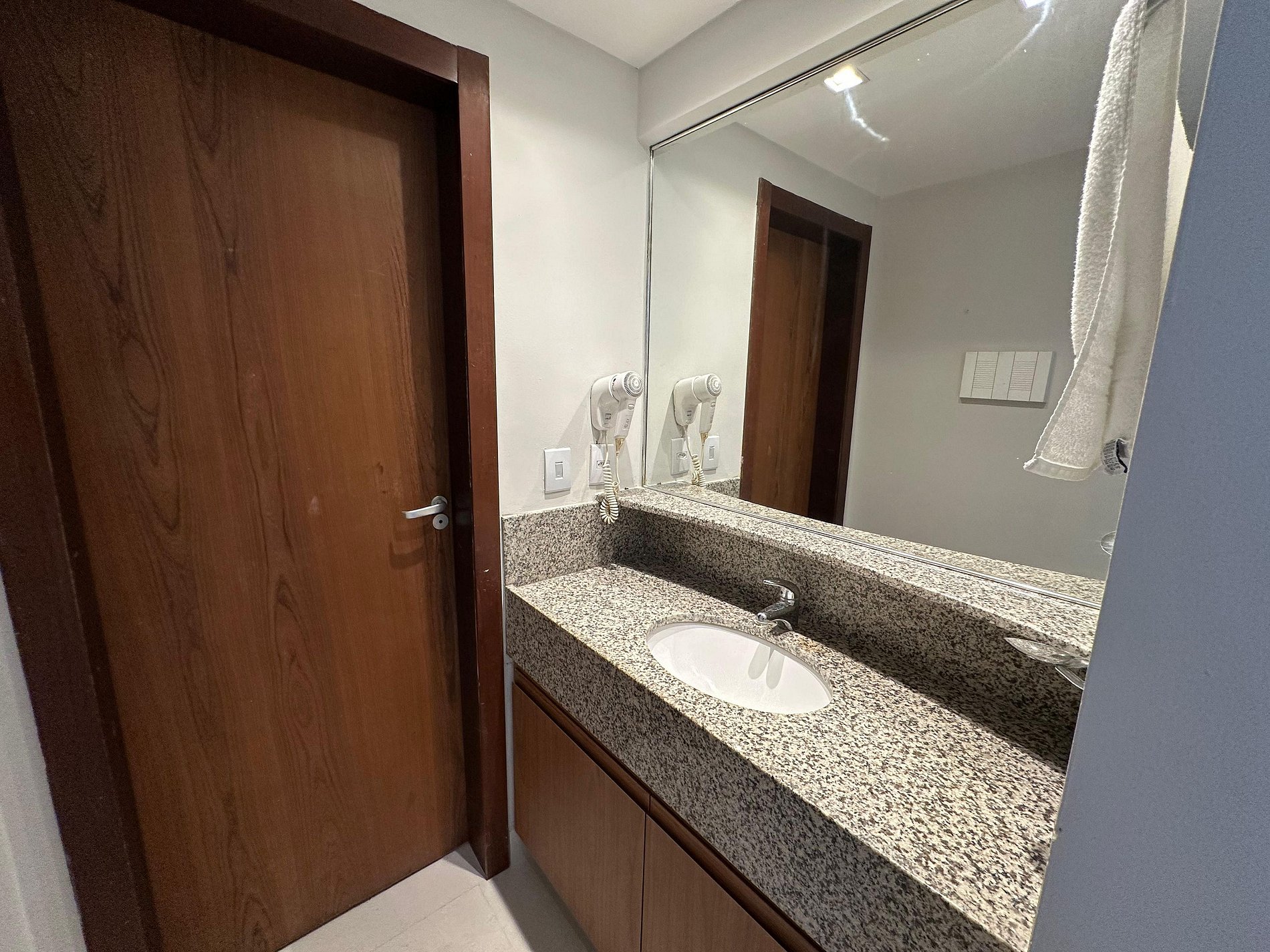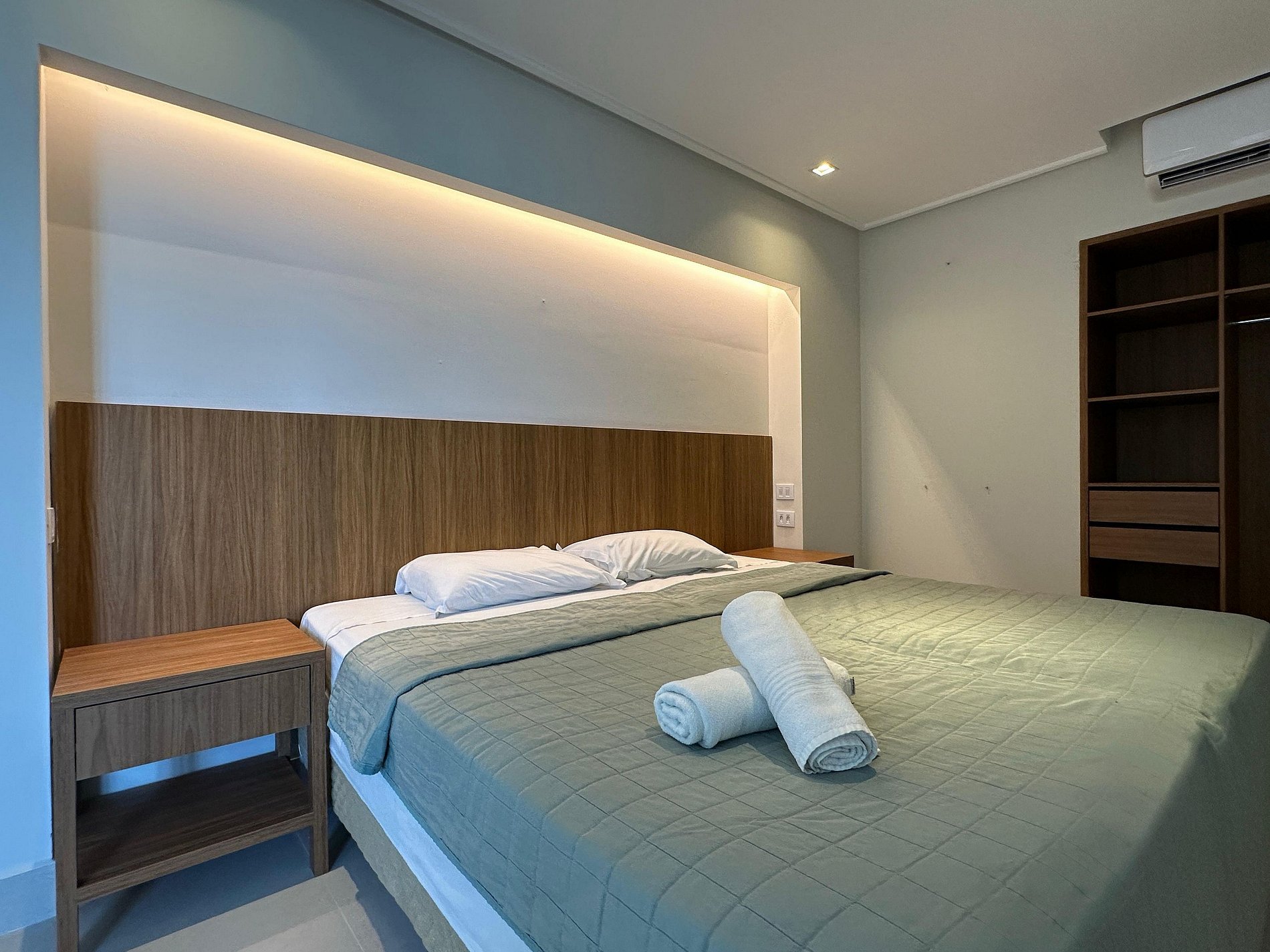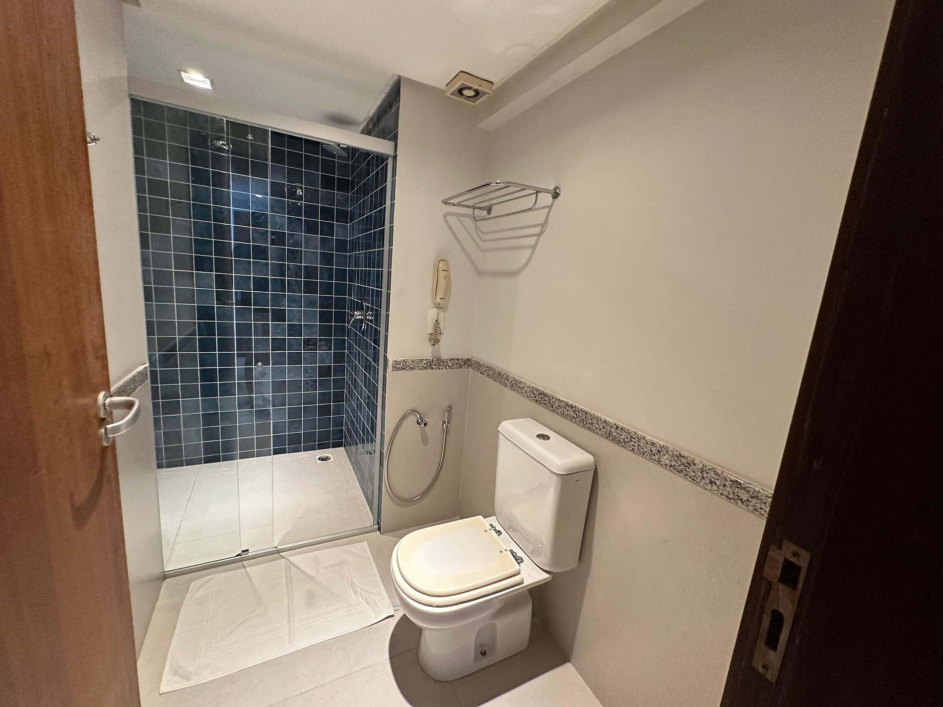 O quarto, com vista lateral para o mar, possui: cama de casal, sofá cama, frigobar, poltrona relaxante, cozinha compacta com mesa de apoio, 2 cadeiras, Wi-Fi, mesas de cabeceira, armário e cabides, ar-condicionado, banheiro com chuveiro quente e secador, Smart TV e interfone.