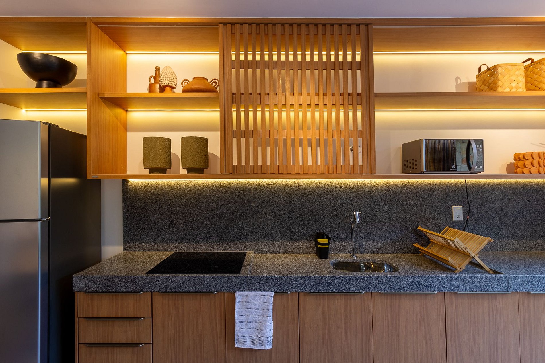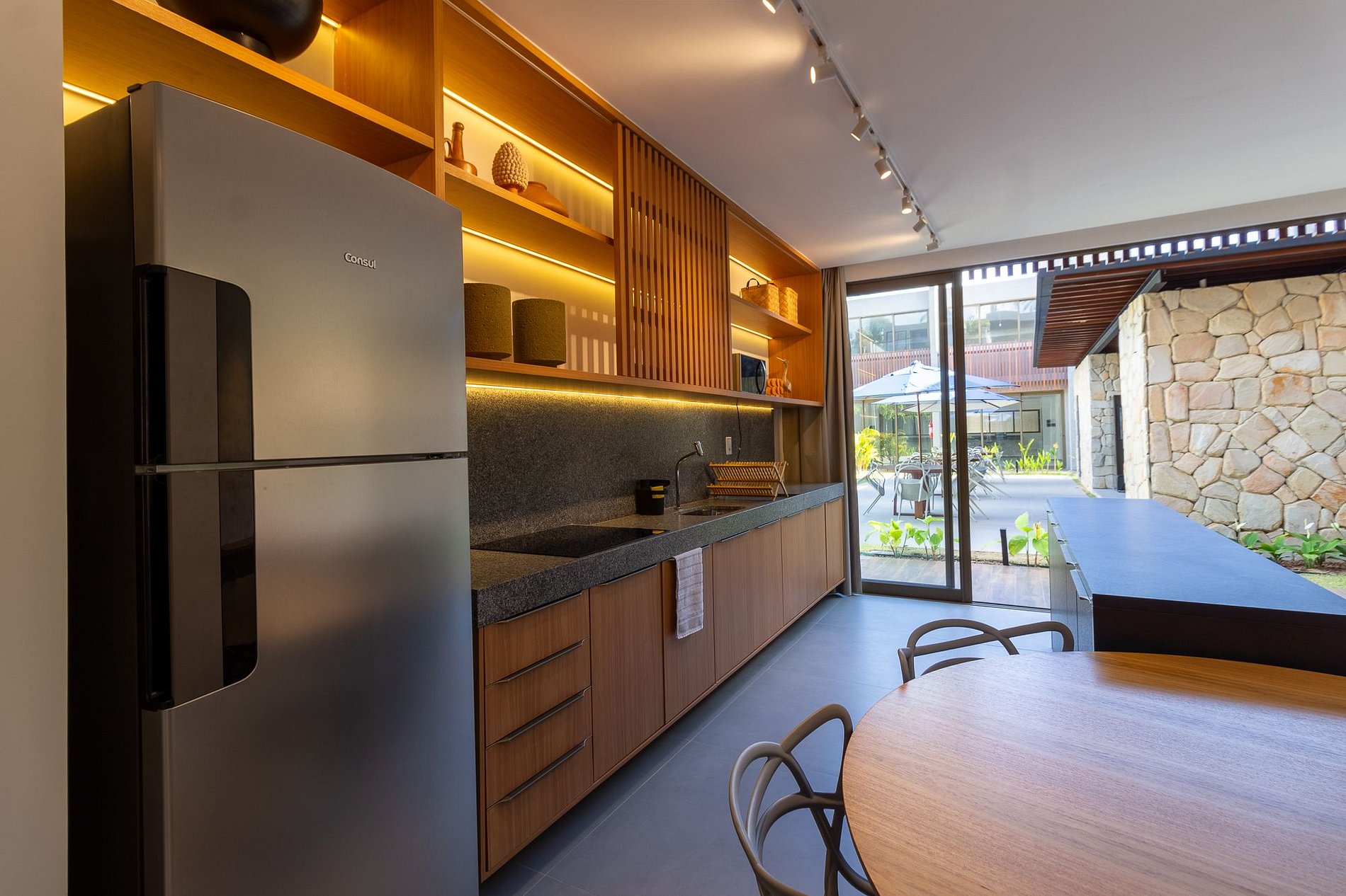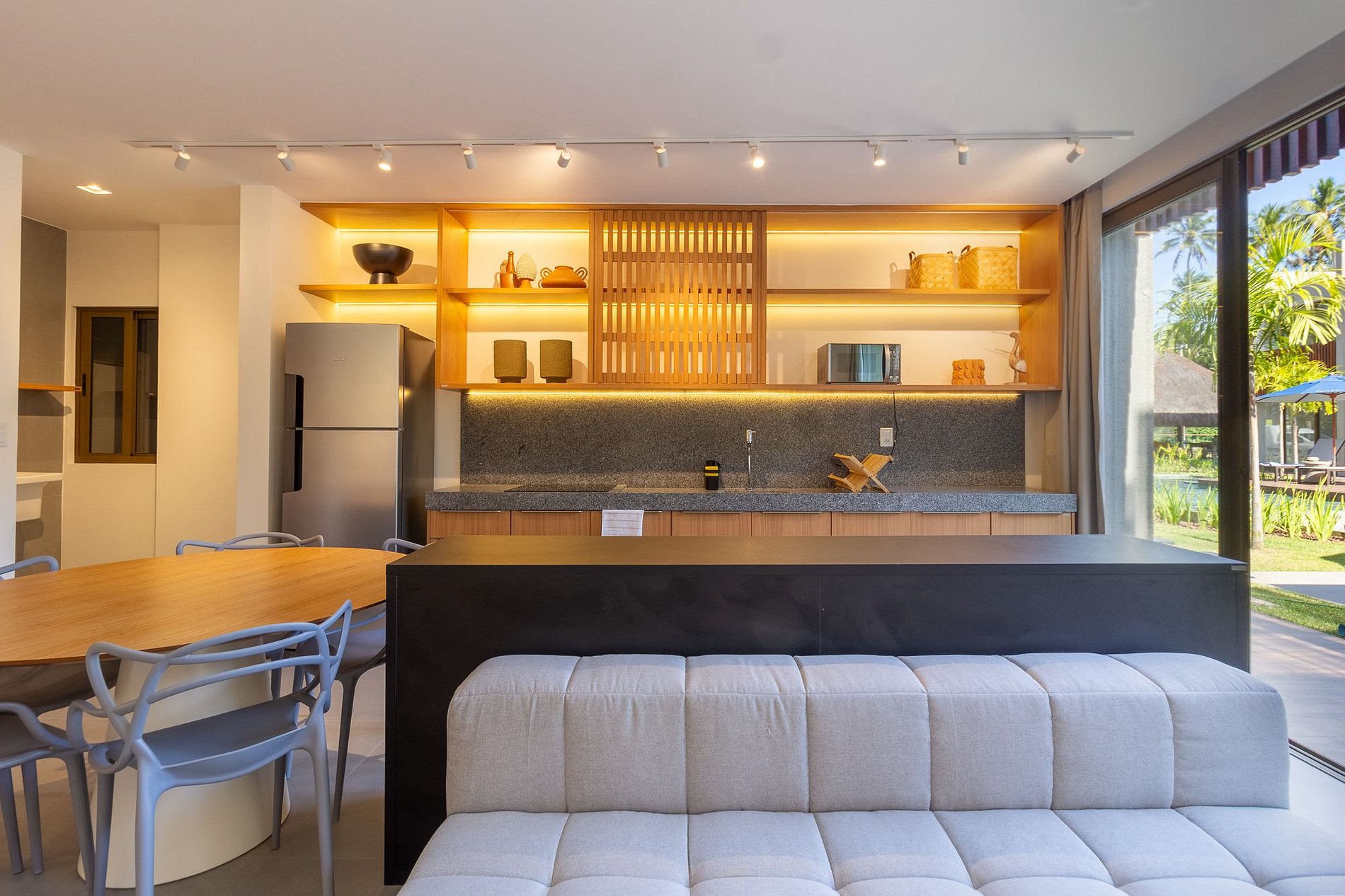 Sala e cozinha integradas: O design aberto da sala e da cozinha promove um espaço arejado e perfeito para recepção de amigos e familiares.