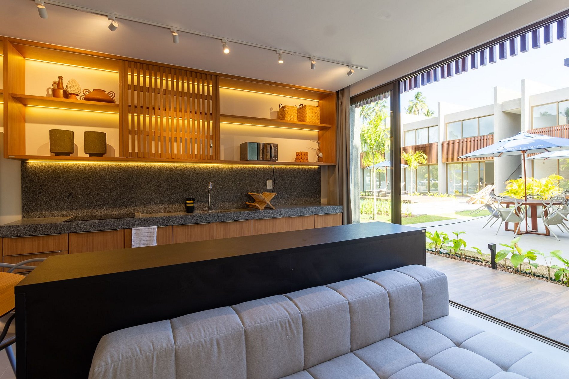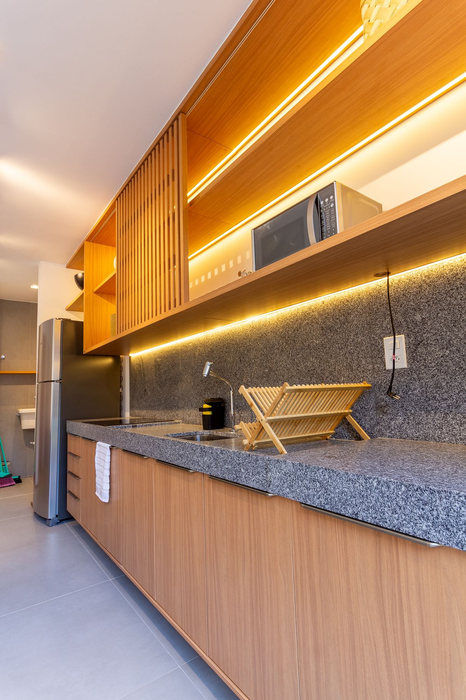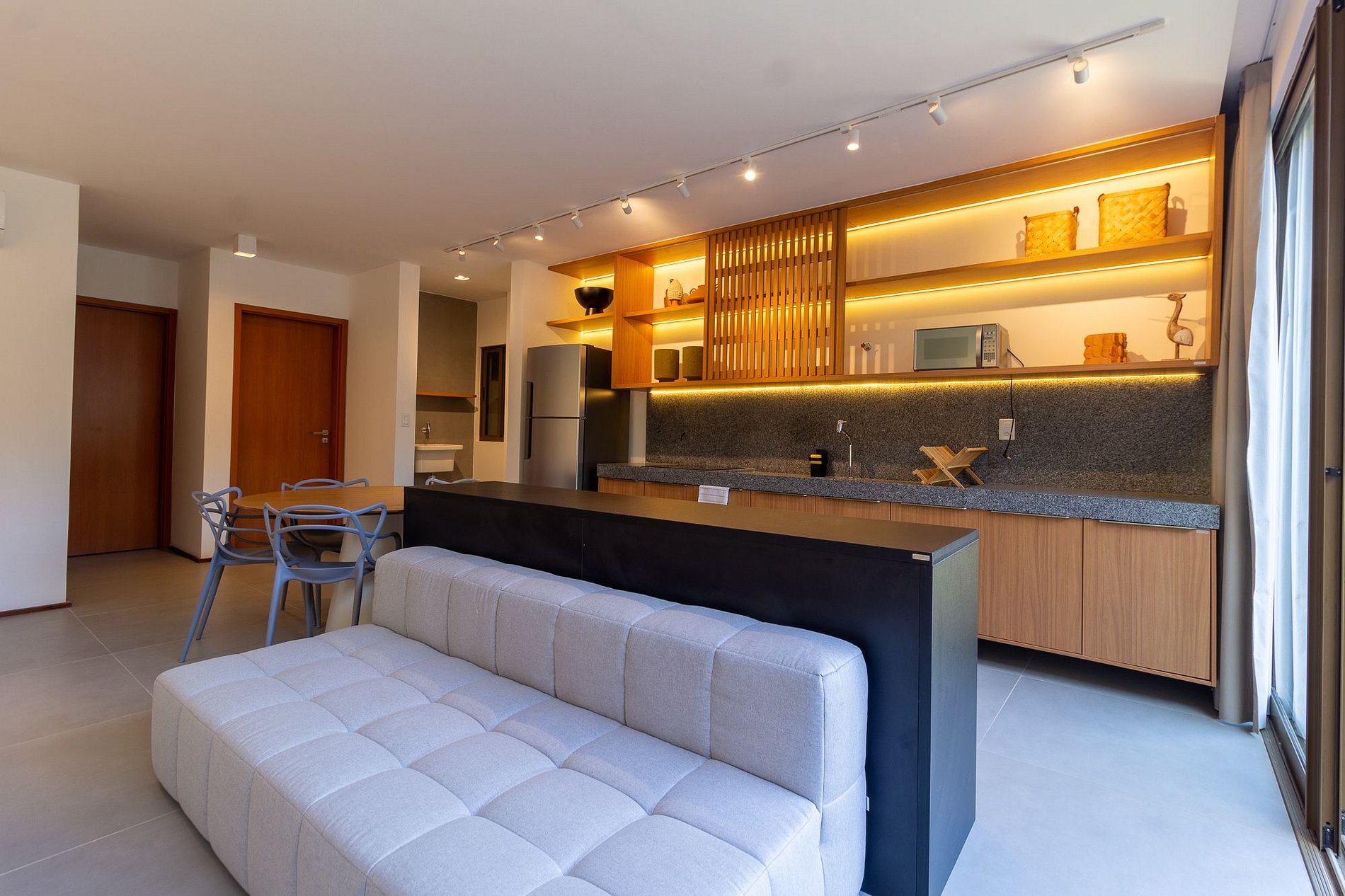 Sala e cozinha integradas: O design aberto da sala e da cozinha promove um espaço arejado e perfeito para recepção de amigos e familiares.