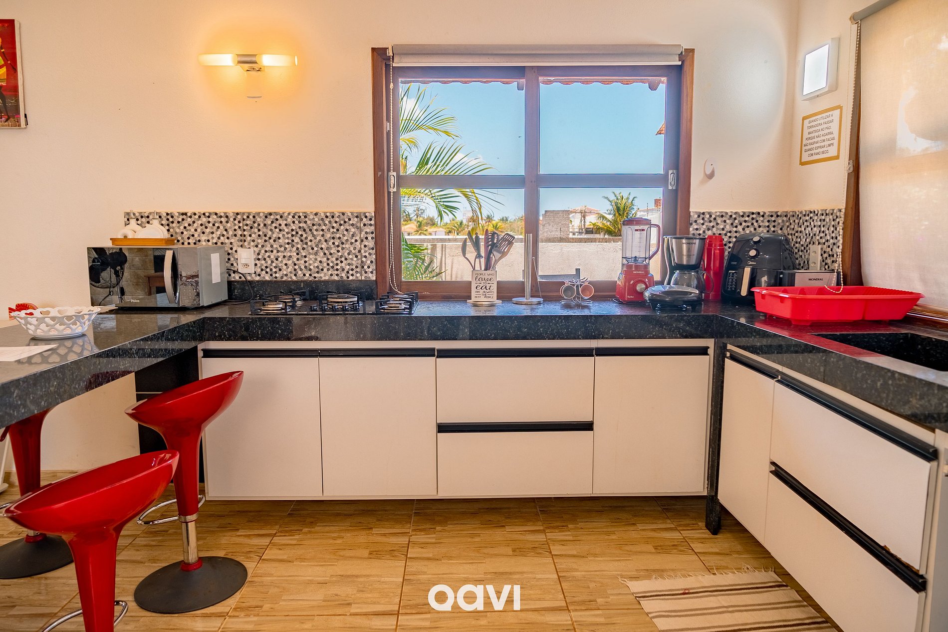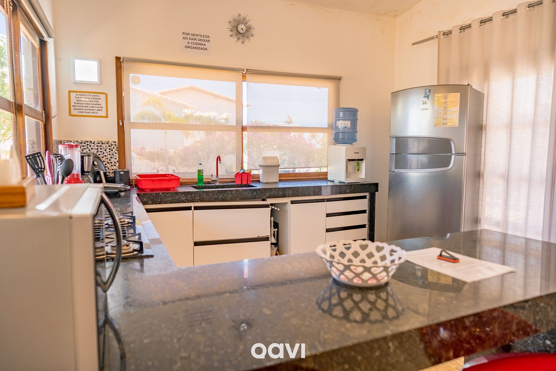 - A cozinha americana possui bancada em mármore em formato “U”, fogão cooktop, geladeira, cafeteira, torradeira, liquidificador, panelas, jogo de talheres, copos e facas, além de armários organizados com todos os itens necessários para o dia a dia.