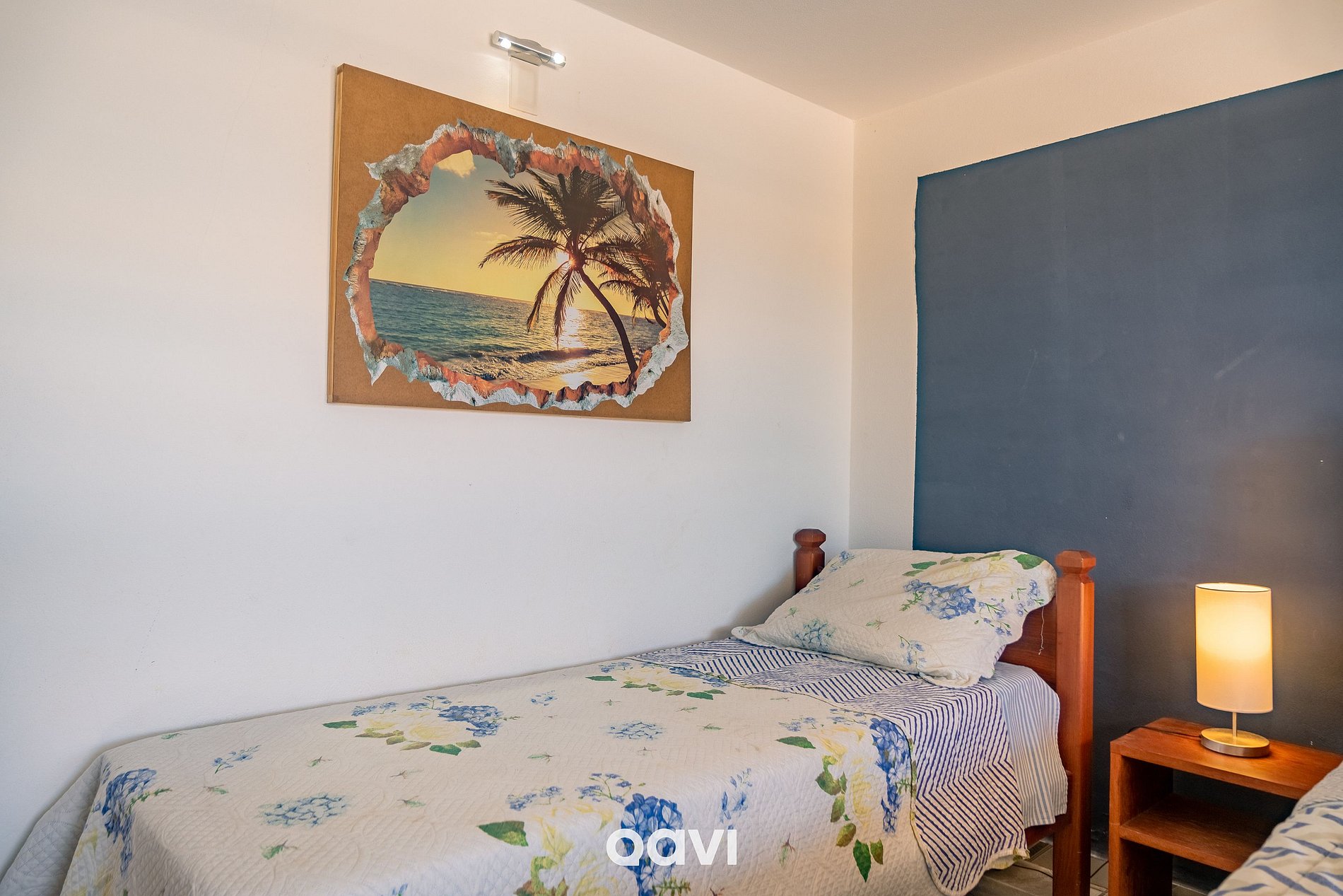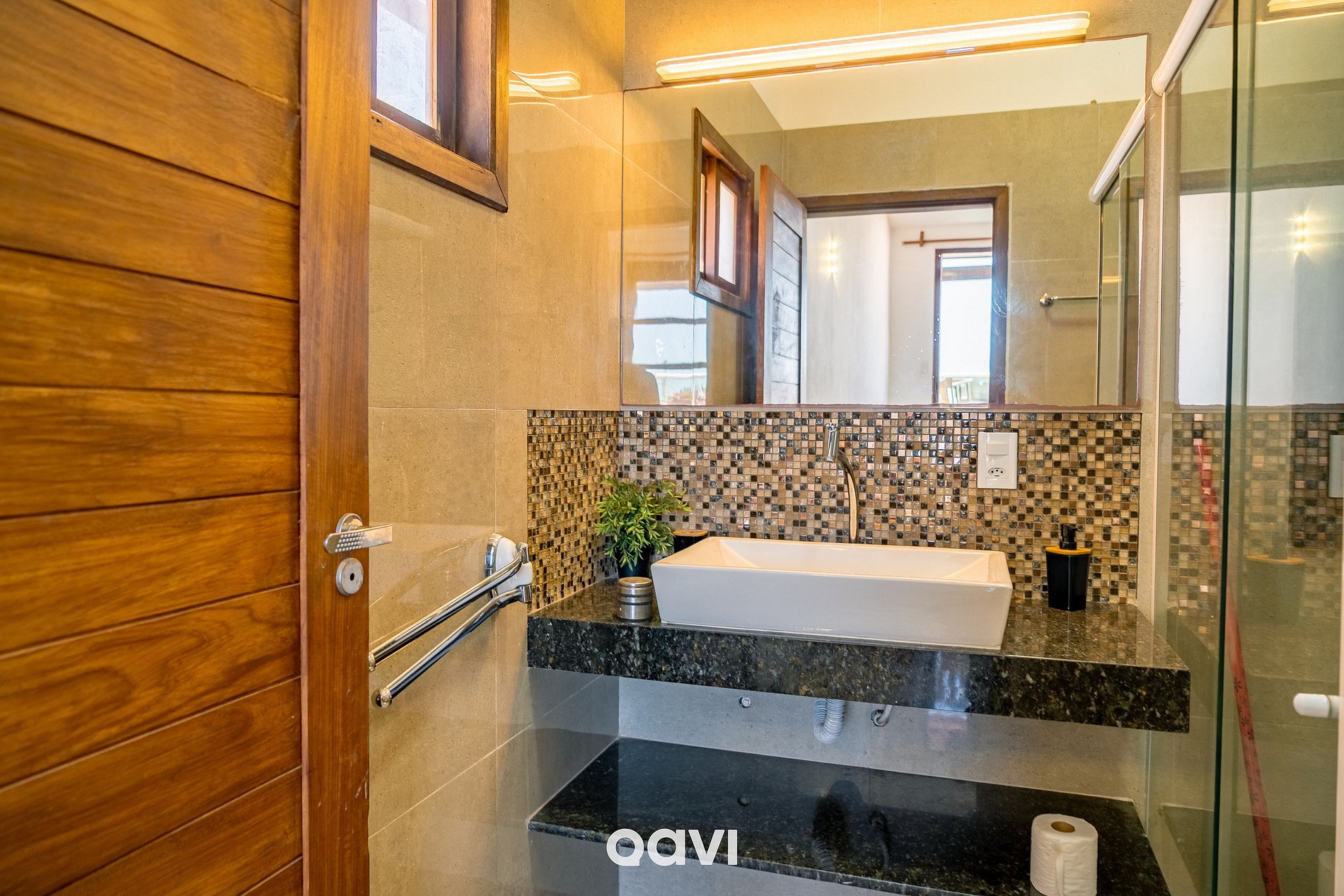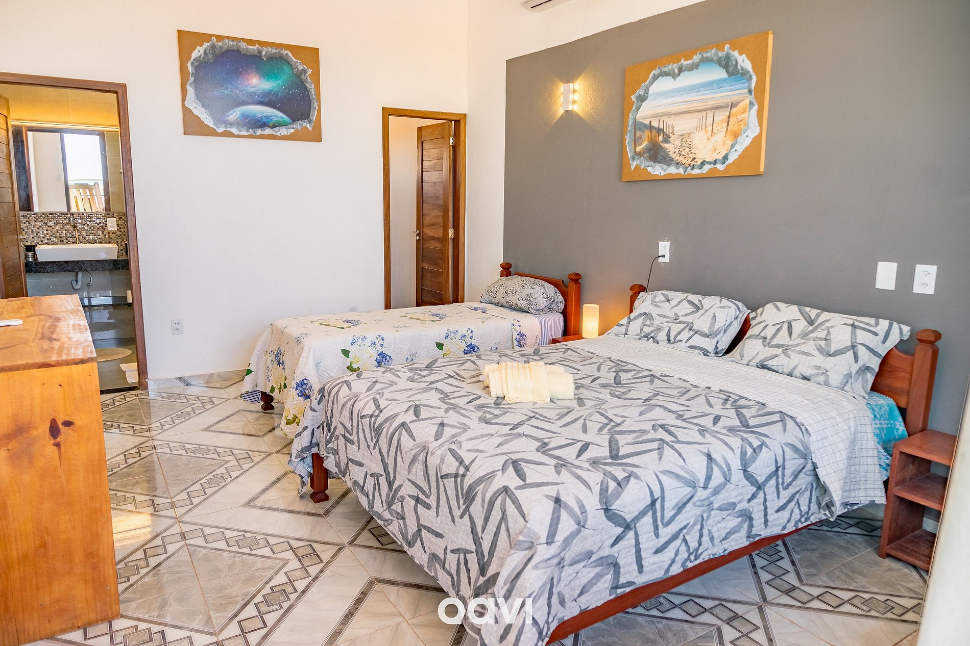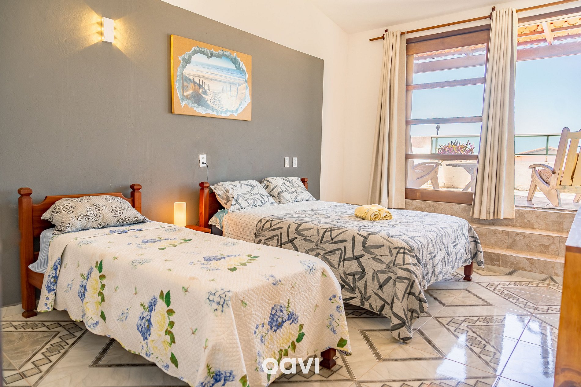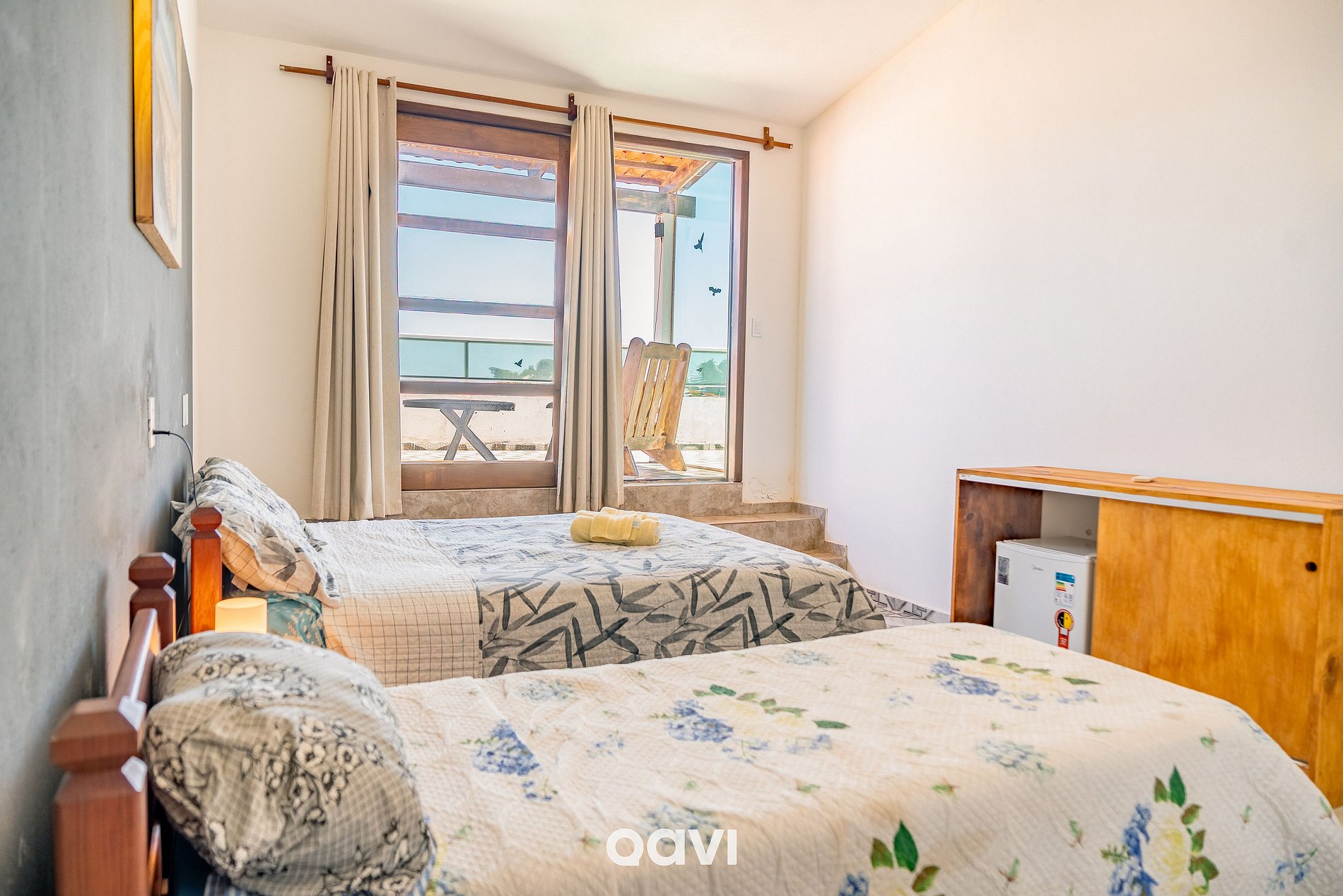 - Suíte 1 (andar superior): cama queen, cama de solteiro, ar-condicionado, frigobar, closet, banheiro com chuveiro elétrico e varanda privativa com vista panorâmica para o mar.