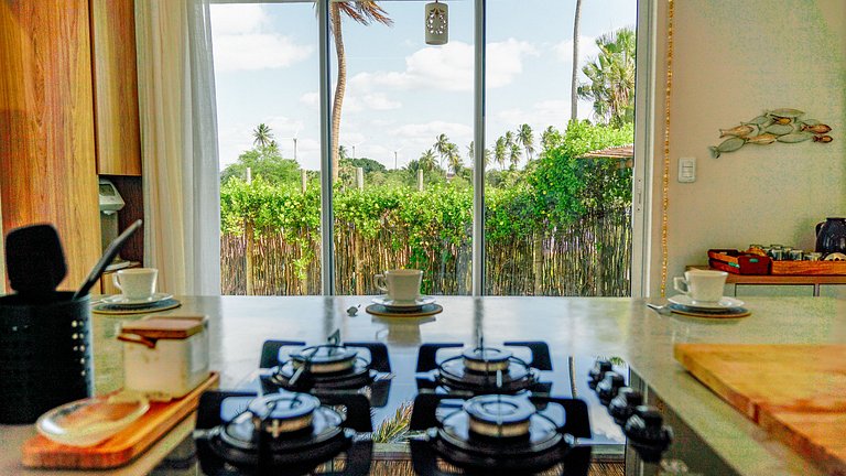 Sala/Cozinha: um confortável sofá retrátil e uma TV smart. Ainda conta com uma caixa de som da bose para animar ainda mais suas confraternizações. Ao lado, no mesmo ambiente, está a cozinha, bem espaçosa e bem completa, com uma mesa de jantar e uma bancada em mármore com fogão cooktop e cadeiras, para reunir os amigos enquanto preparam seus alimentos. Também conta com geladeira, micro-ondas, air fryer, gelágua, forno elétrico, torradeira, além de pratos, copos, taças, talheress e demais utensílios essenciais para sua estadia.