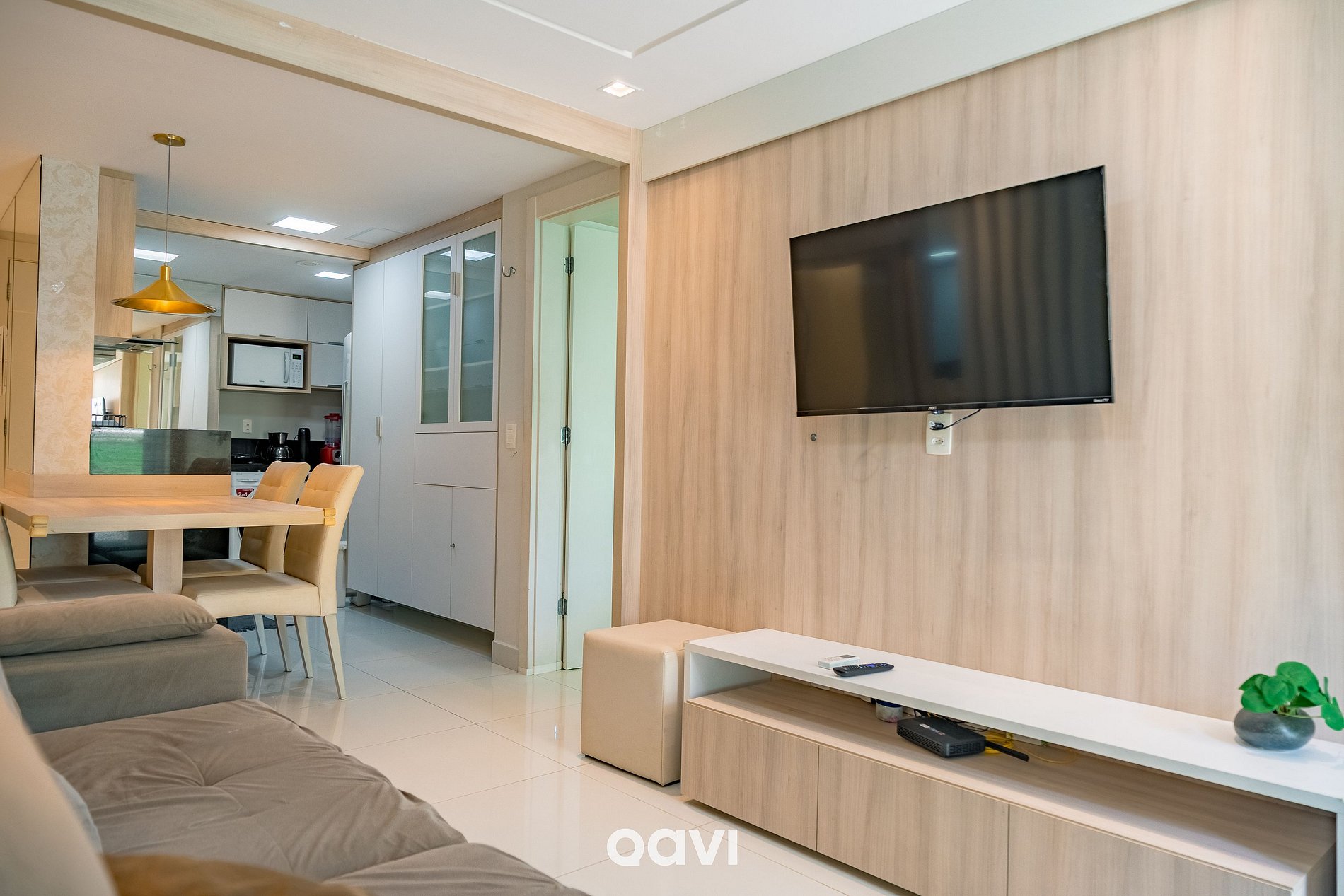 Sofá confortável, TV, Acesso à varanda com vista lateral para o mar, Ambiente integrado à cozinha