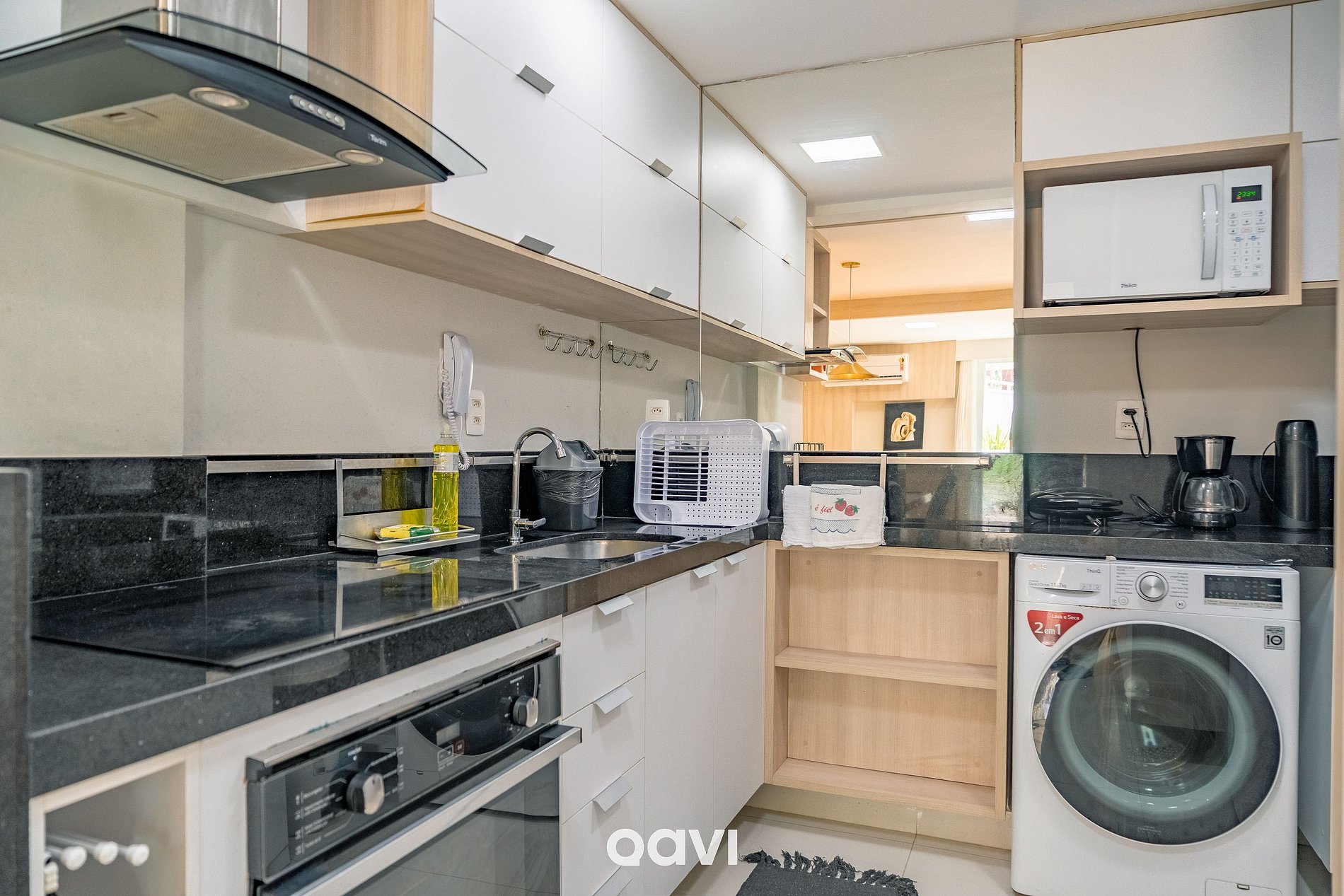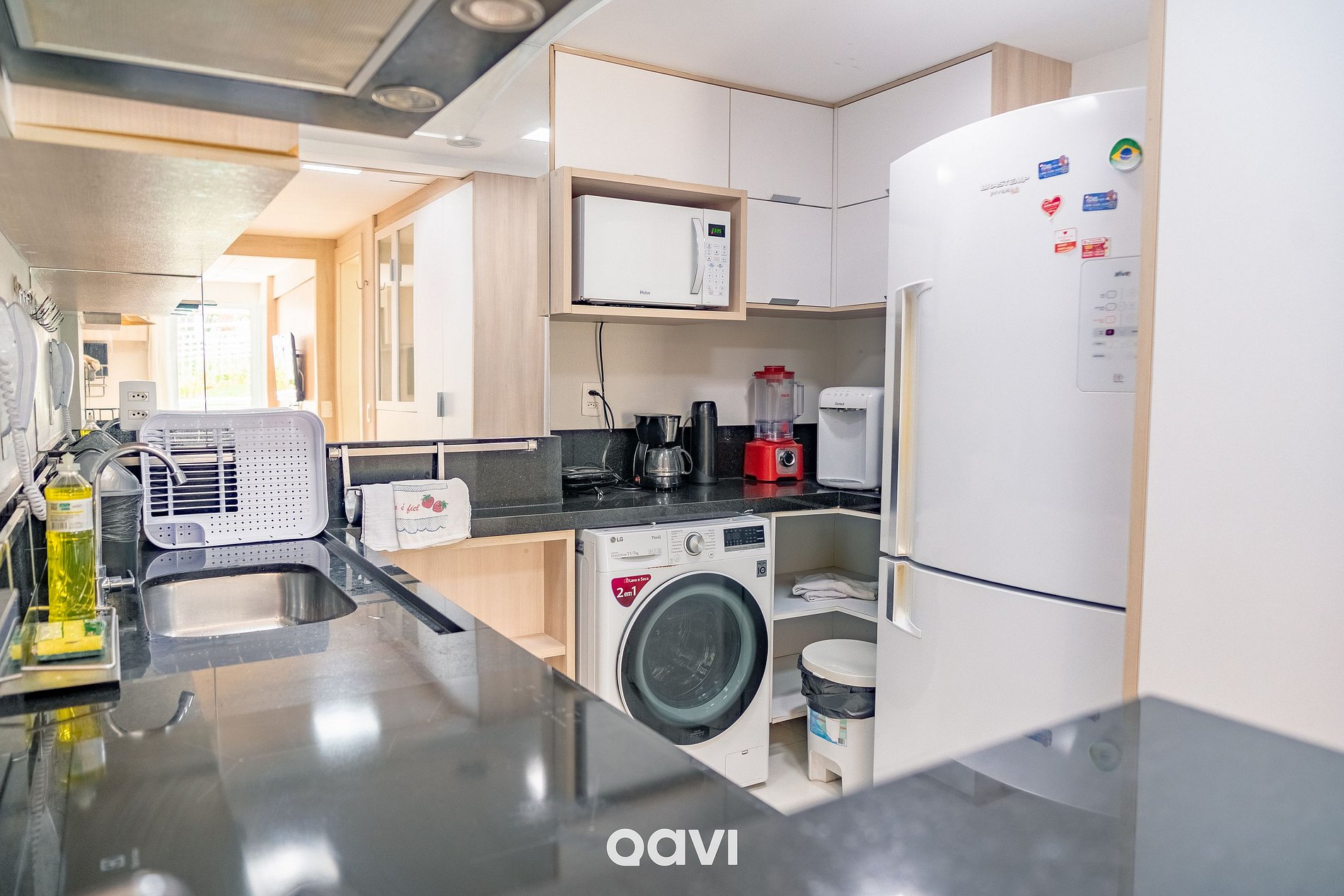 Cozinha funcional e totalmente equipada para sua estadia, Geladeira com freezer, Micro-ondas, Forno, Cooktop elétrico de 4 bocas, Liquidificador, Máquina de lavar e secar, Utensílios diversos: pratos, copos, taças, talheres e panelas