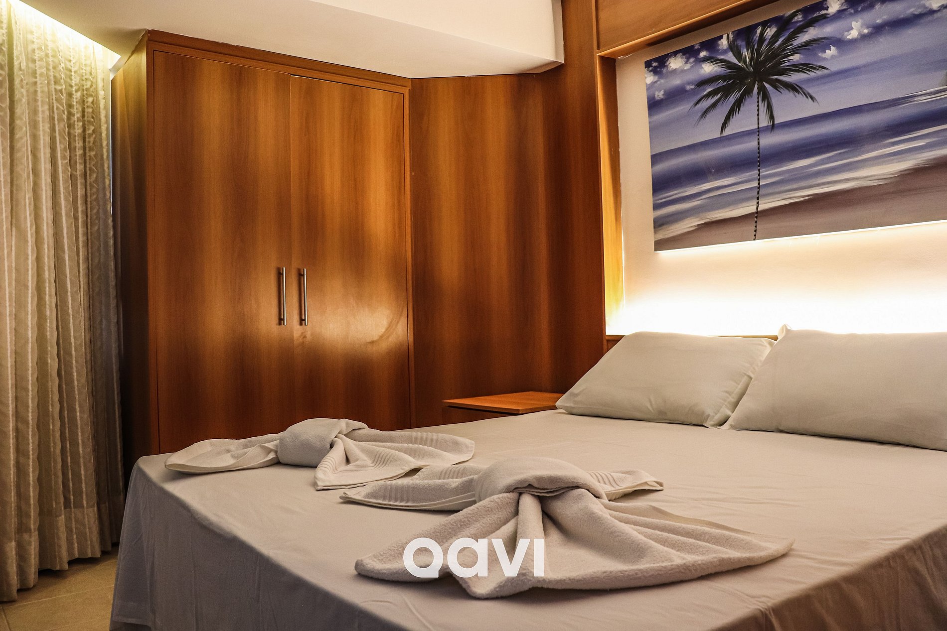 - Quarto: Cama de casal, ar-condicionado, mesa de cabeceira e guarda roupa.