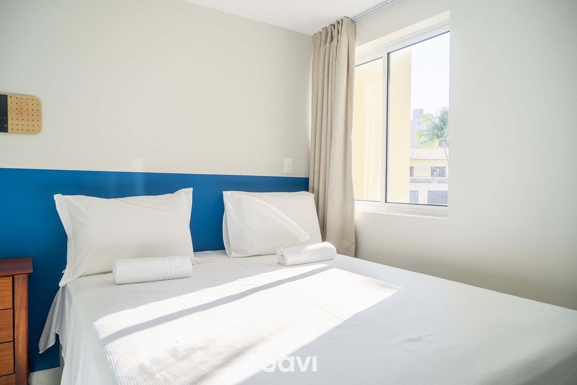 cama queen, guarda-roupa, ar-condicionado, cortina blackout, varanda e banheiro completo;