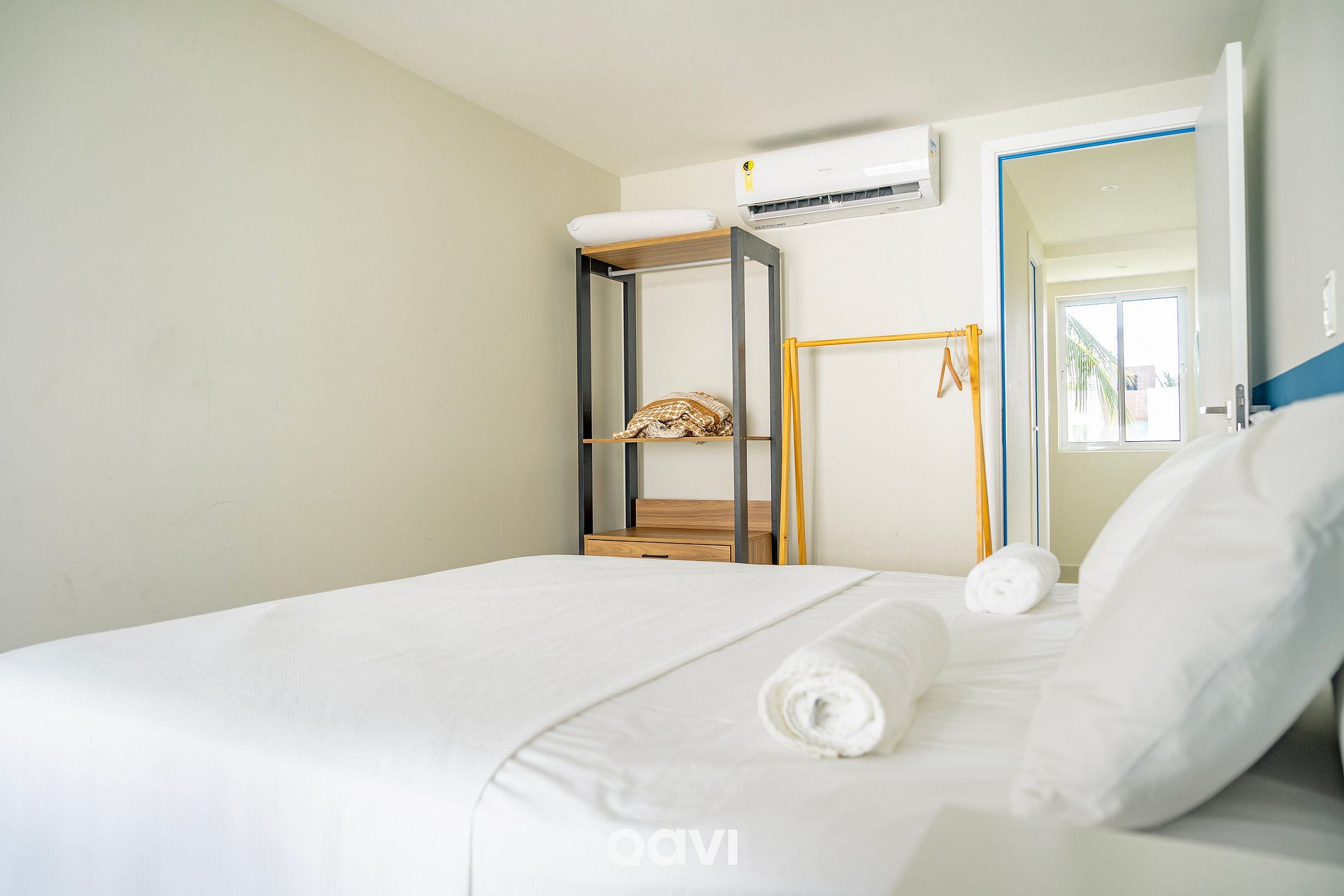 cama queen, penteadeira, guarda-roupa, ar-condicionado, cortina blackout e banheiro completo;