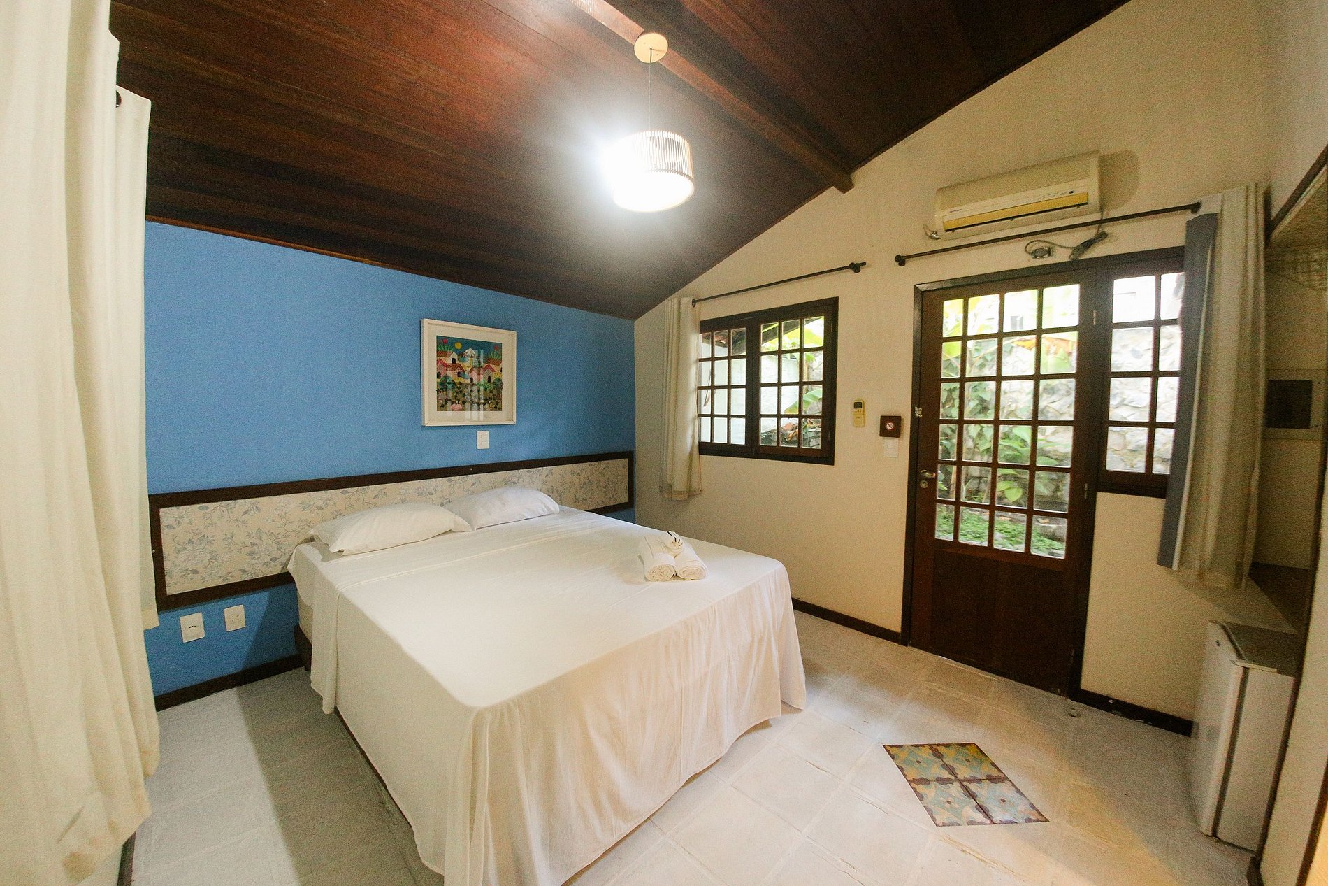 - Quarto com 1 cama de casal e 1 cama de solteiro, mesa de cabeceira e luminária e banheiro com aquecimento solar.