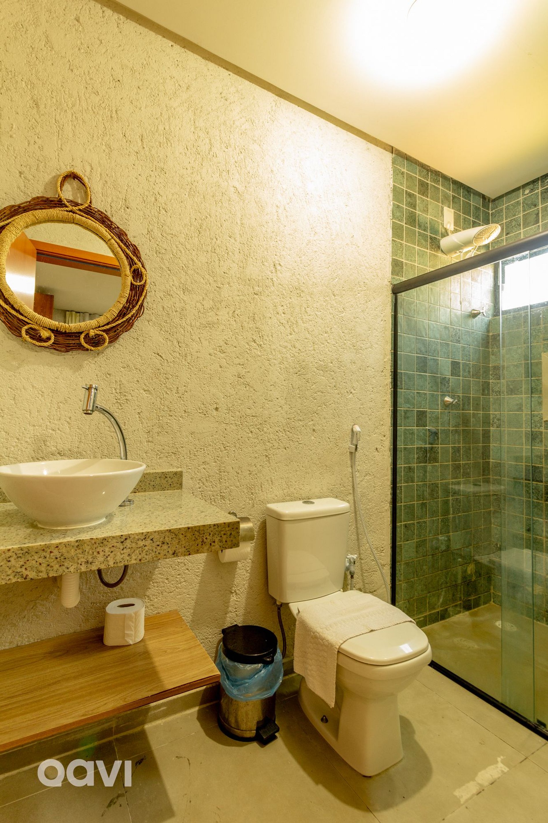 • Suíte 1: cama de casal, ar-condicionado, aparelhos decorativos e banheiro com utensílios básicos;