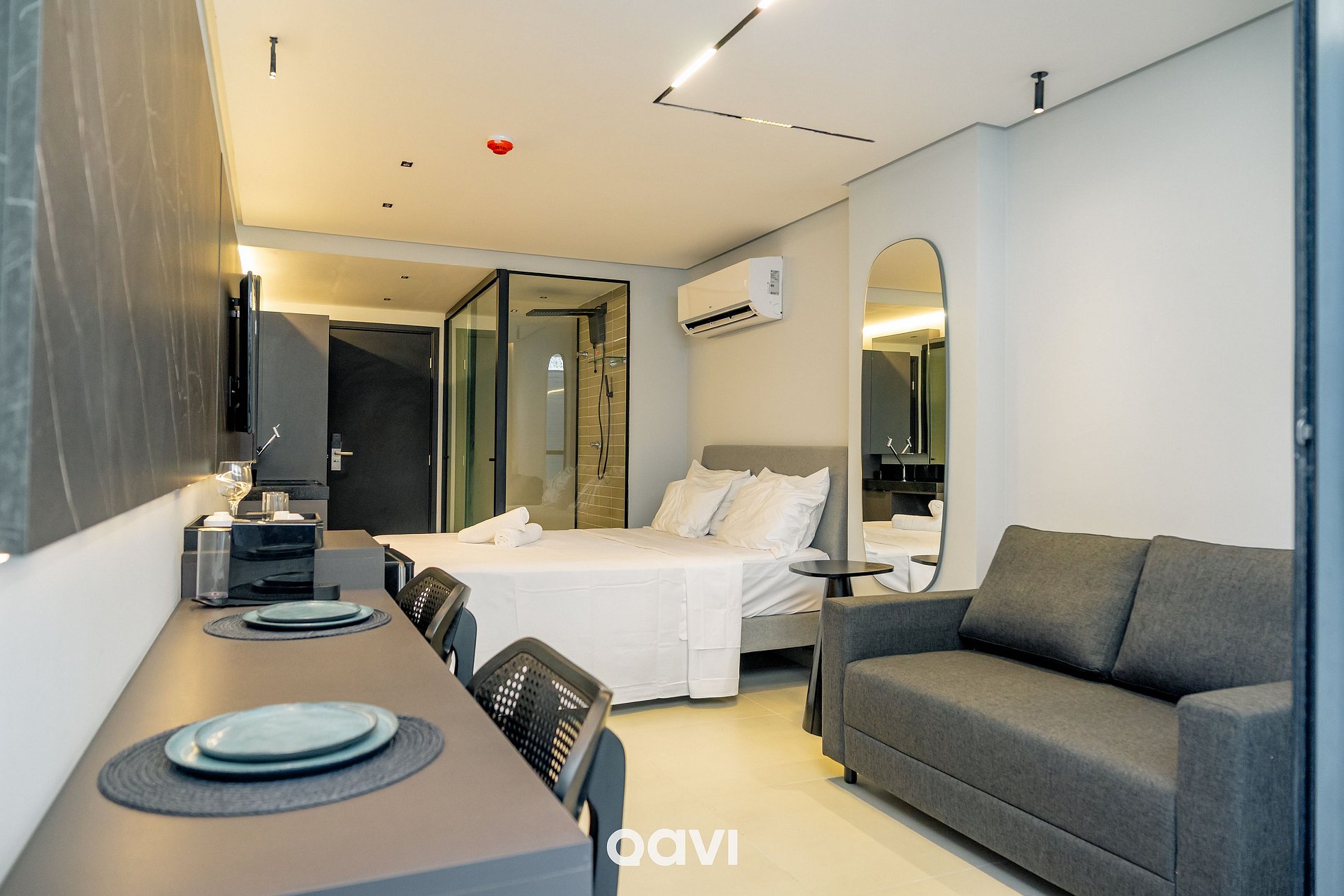 O flat é composto por uma suíte com cama de casal comportando até 2 pessoas, ar condicionado, frigobar, máquina de café, mesa para 2, sofá e TV Smart.