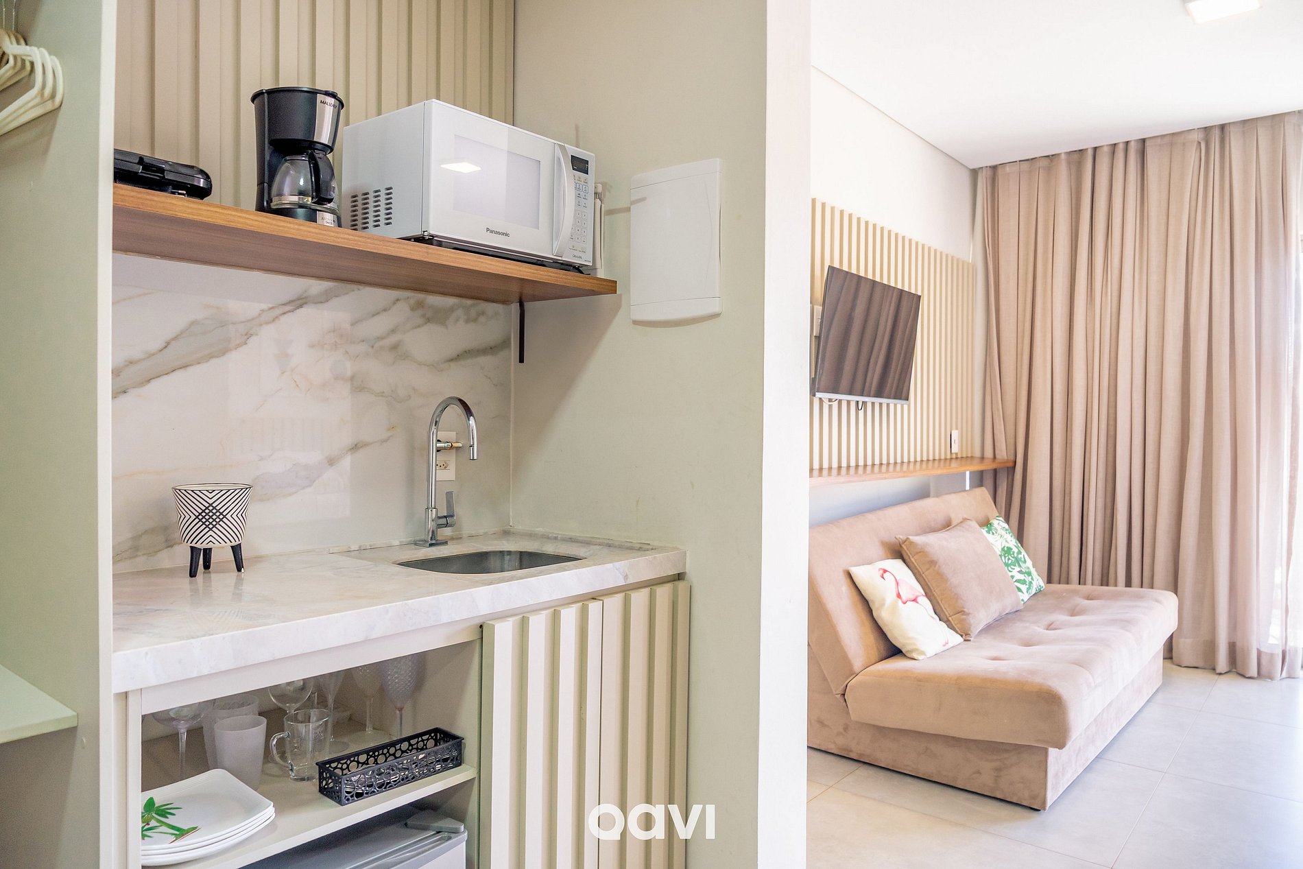 • Cozinha Gourmet: Frigobar + micro-ondas, torradeira, Cafeteira elétrica e kit completo de utensílios (talheres, pratos e copos, cutelaria);
