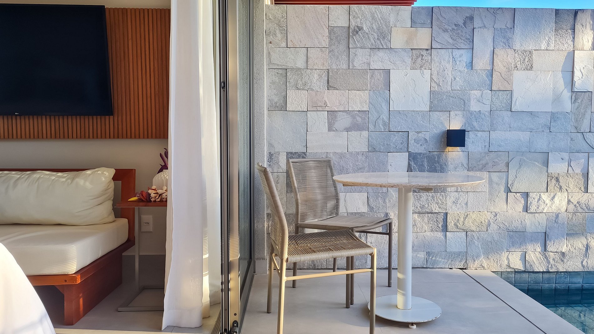 Deck molhado: No exterior da suíte contamos com espreguiçadeiras e mesa com cadeiras.