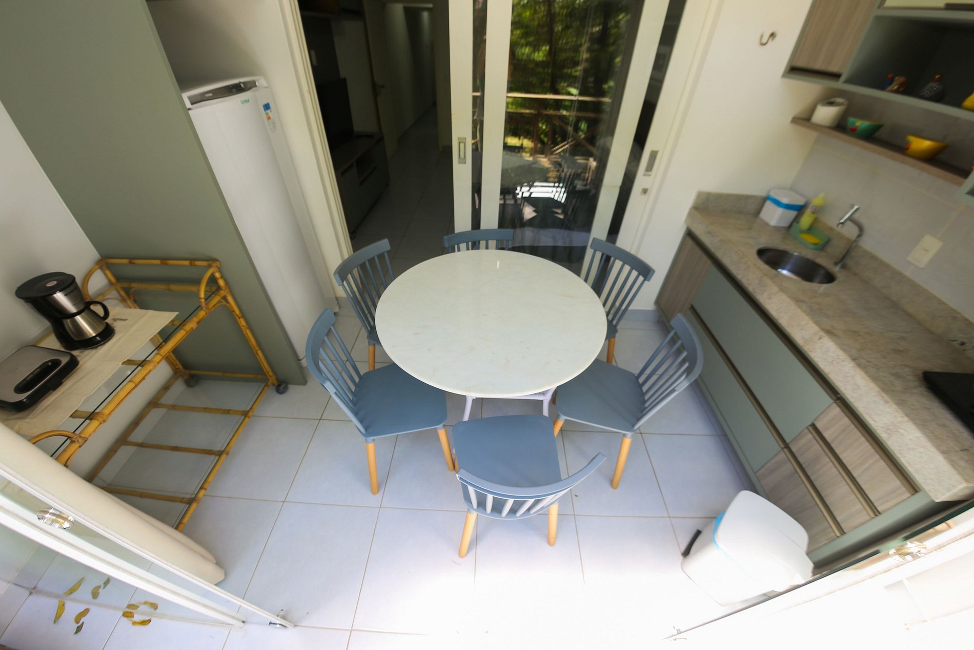 Varanda gourmet: Mesa e cadeiras, uma bancada em granito com pia, cooktop, diversas panelas de aquecimento por indução e uma linda vista da piscina do condomínio;
