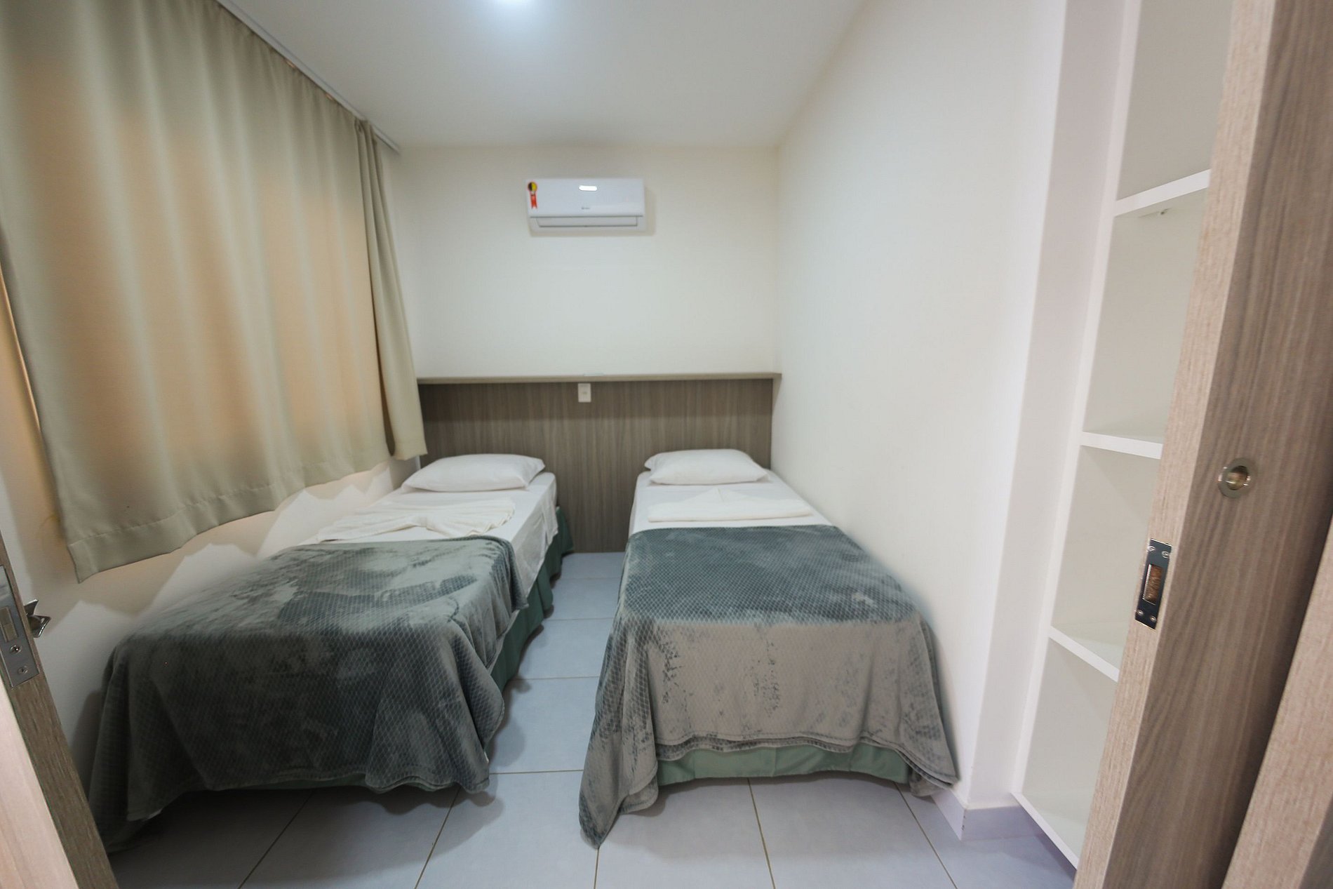 Quarto 2: duas camas de solteiro, ar-condicionado e prateleira;
