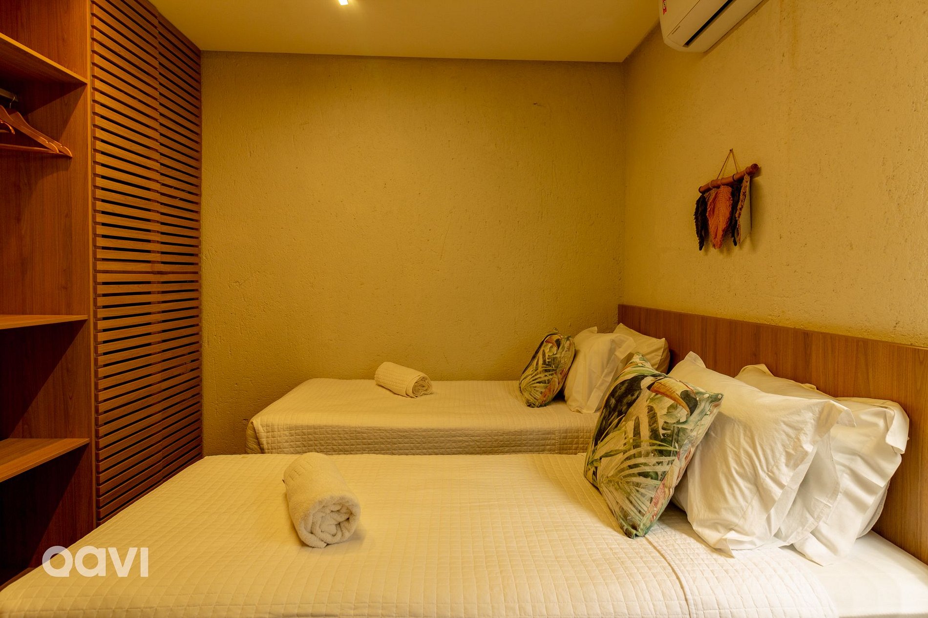 • Suíte 2: duas camas de solteiro + 1 auxiliar, ar-condicionado, armário e blackout nas cortinas;