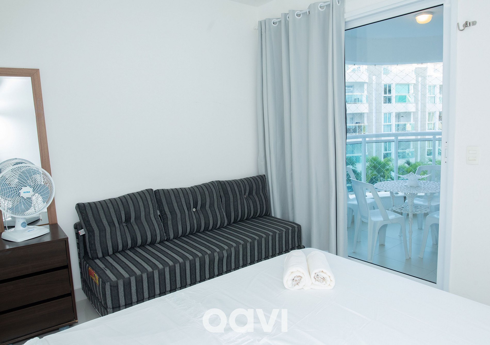 - Quarto 1: 1 cama de casal Queen, 1 sofá-cama de solteiro, ar-condicionado, cortina blackout e acesso à varanda;
