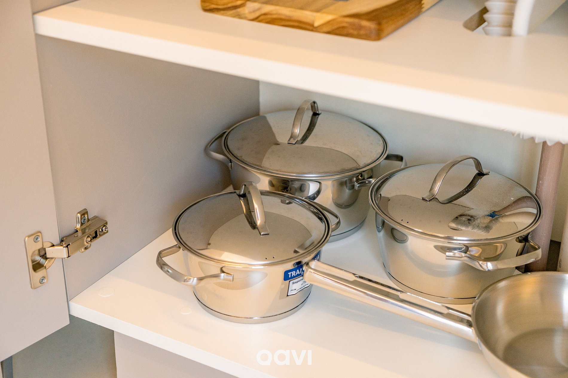 Cozinha: equipada com cafeteira de cápsula Nespresso, sanduicheira 2 em 1, liquidificador, micro-ondas, fogão de indução e utensílios básicos (panelas, copos, taças e talheres).