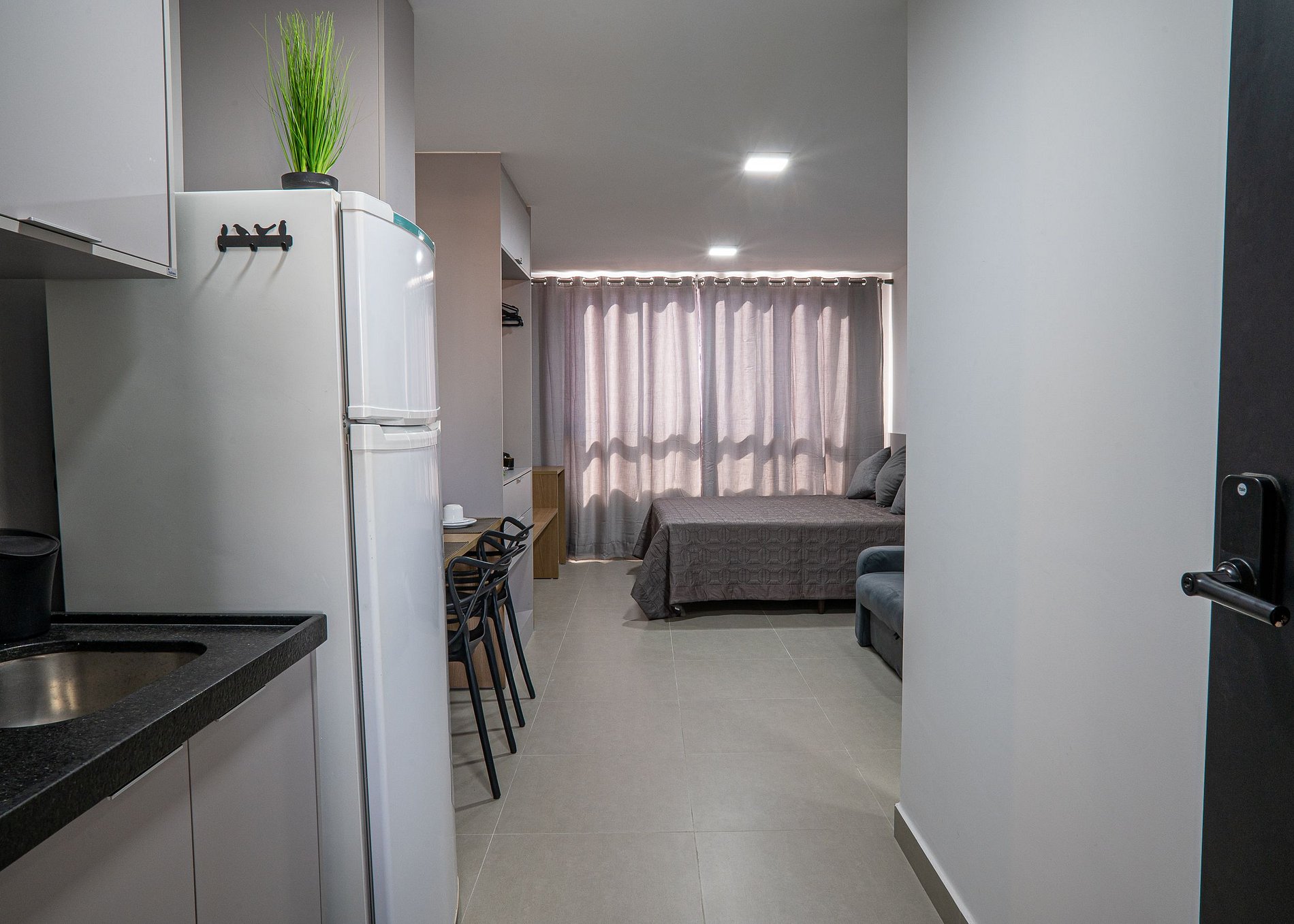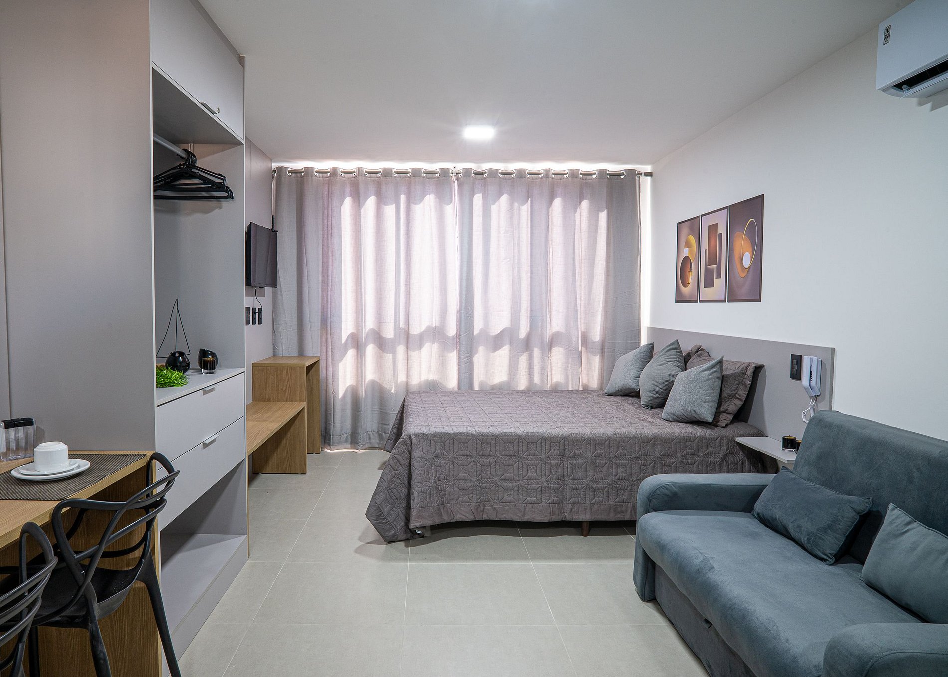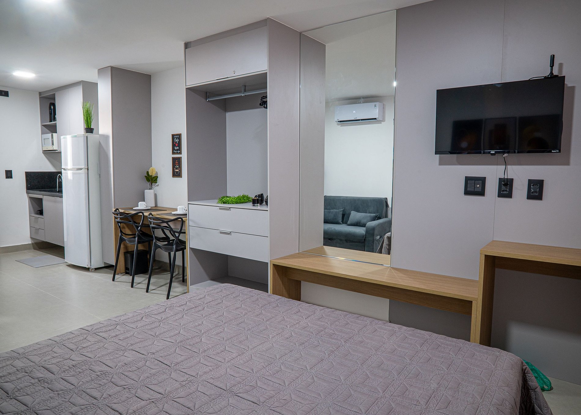 O apartamento que tem um finíssimo acabamento, é uma suíte integrada, com cozinha, mesa para refeições, 2 cadeiras e Wi-fi, sendo todo o ambiente planejado para proporcionar conforto e praticidade aos hóspedes.