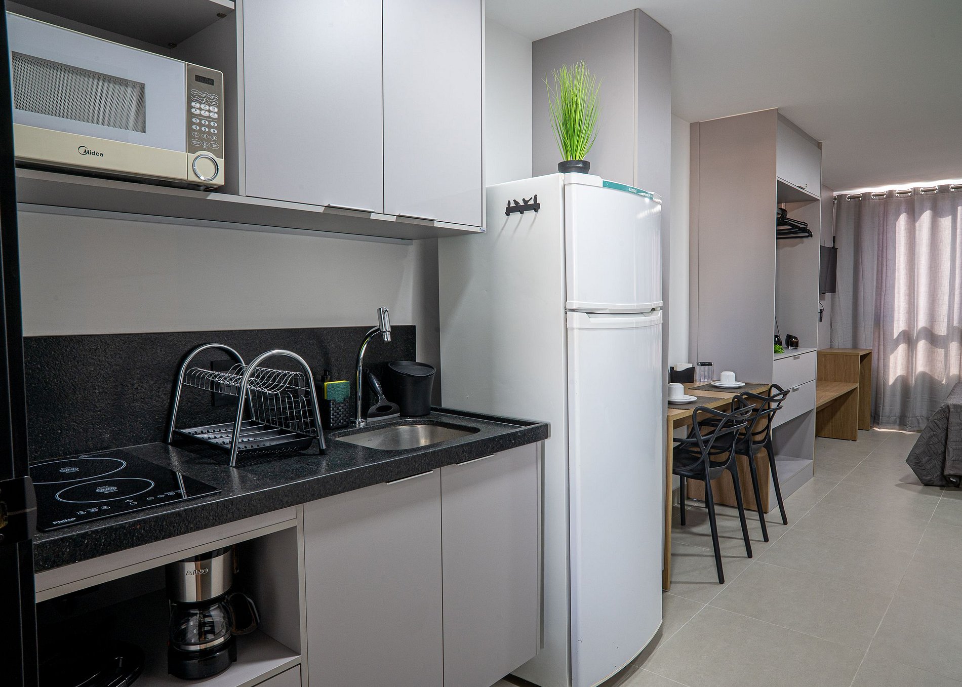 - Cozinha: Micro-ondas e geladeira, fogão de indução, cafeteira elétrica e utensílios básicos (panelas, copos e taças);