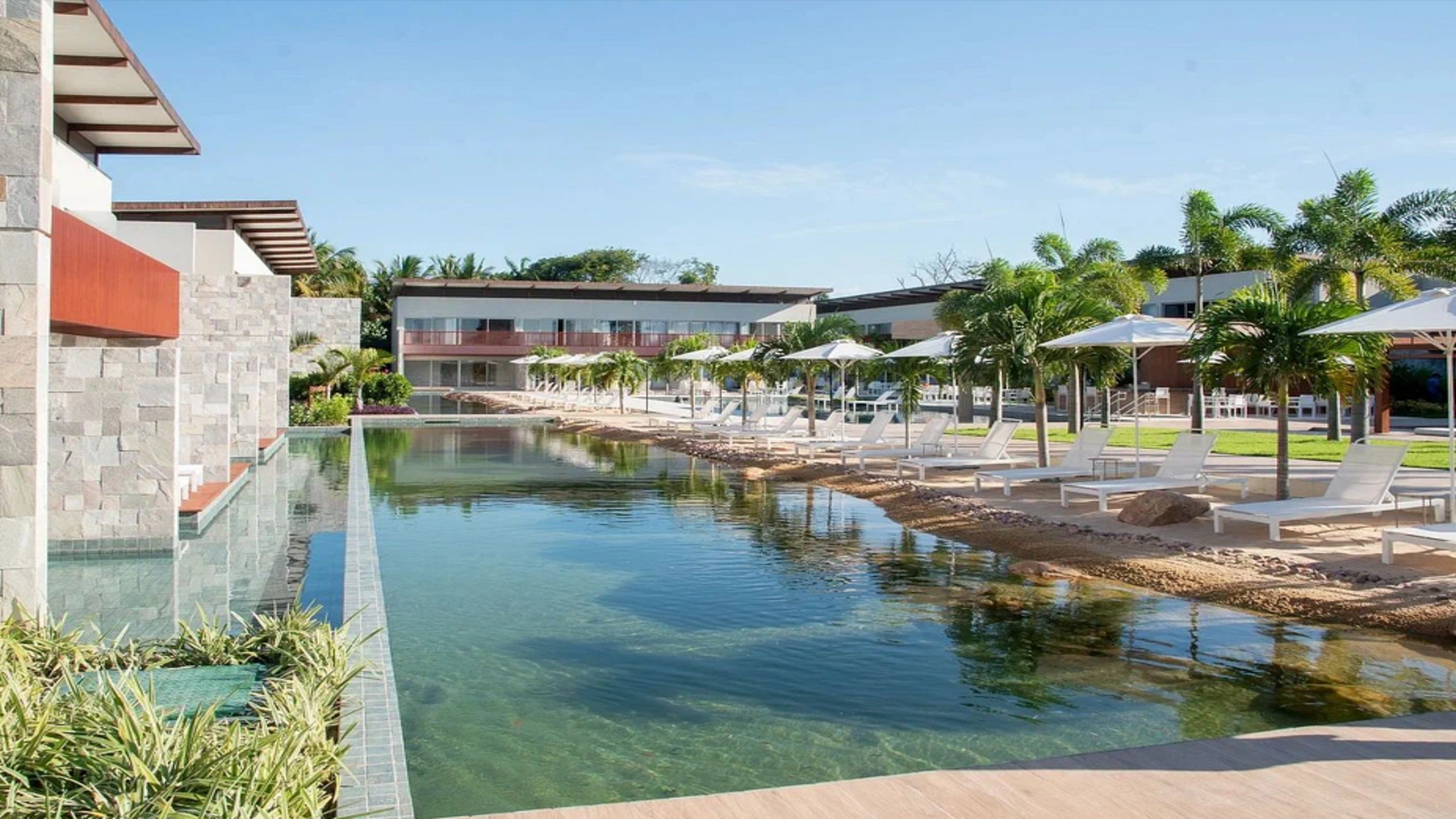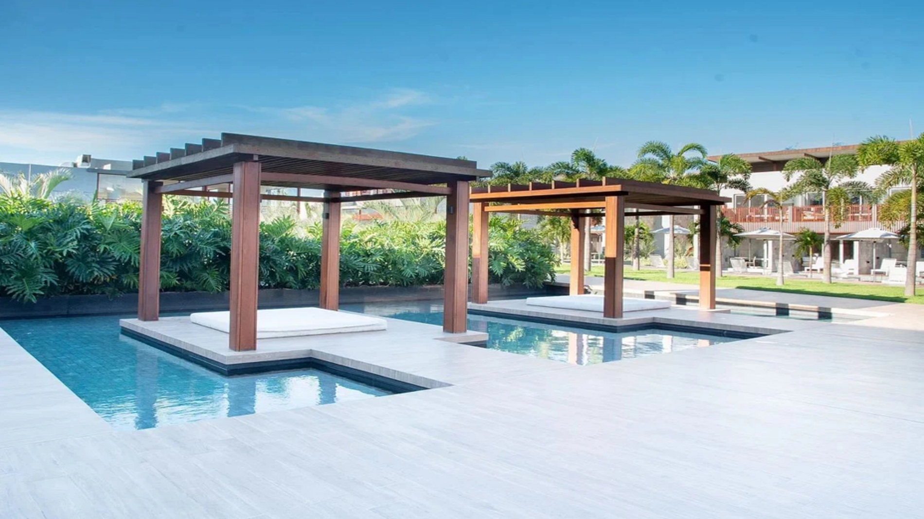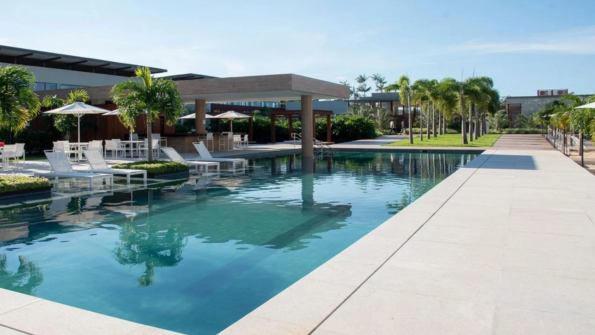 O condomínio possui um belo jardim e uma piscina adulta central, além disso, possui uma praia artificial com espreguiçadeiras, restaurante, bar, academia e estacionamento privativo (1 vaga por flat).
