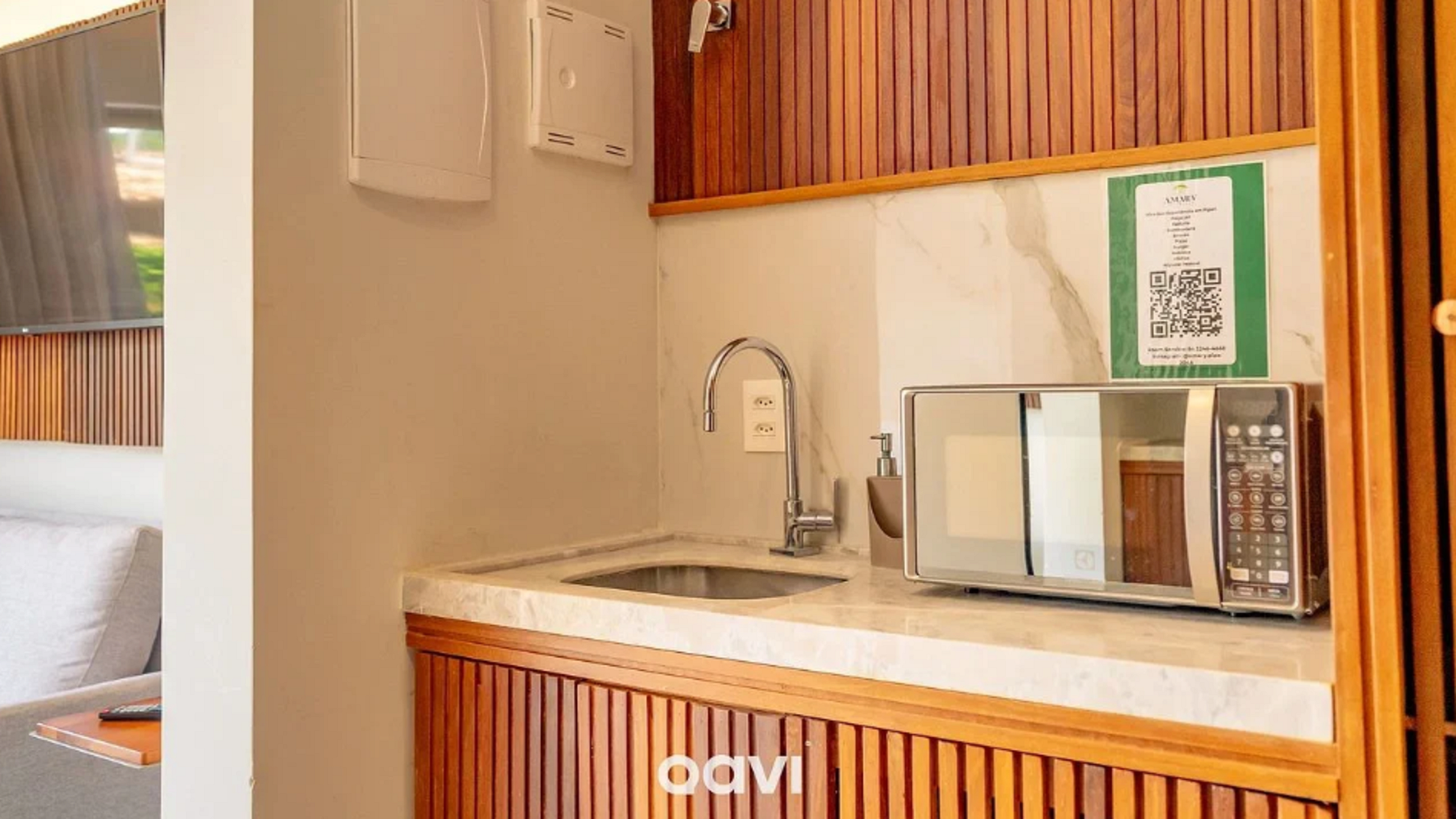 - Cozinha compacta: Utensílios de cozinha (jogo de talheres, copos, taças de vinho, xícaras e pratos), microondas, cafeteira, sanduicheira e frigobar.