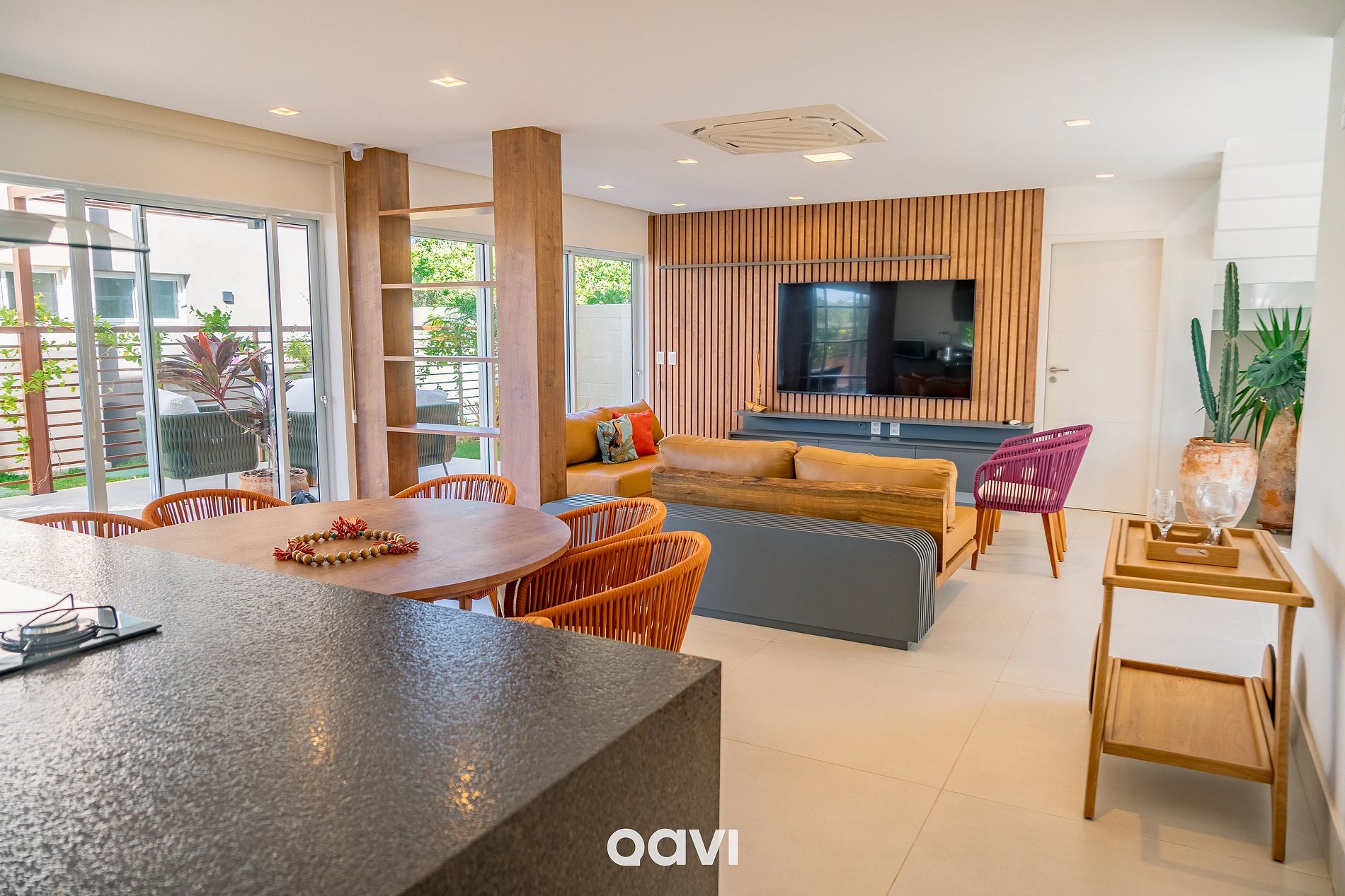 Sala: ampla, sofá, Smart TV e integração total com a cozinha.