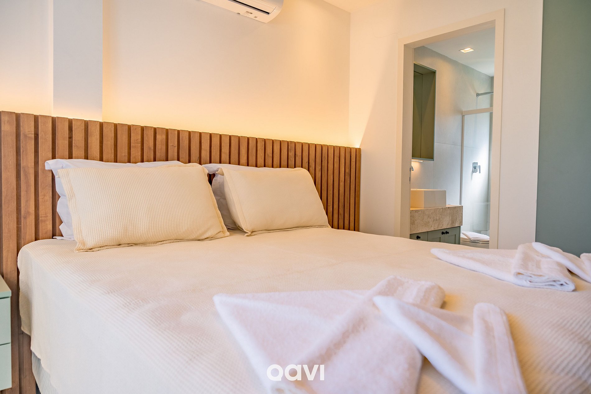 Suíte Master: cama de casal king, ar-condicionado, armário e banheiro completo.