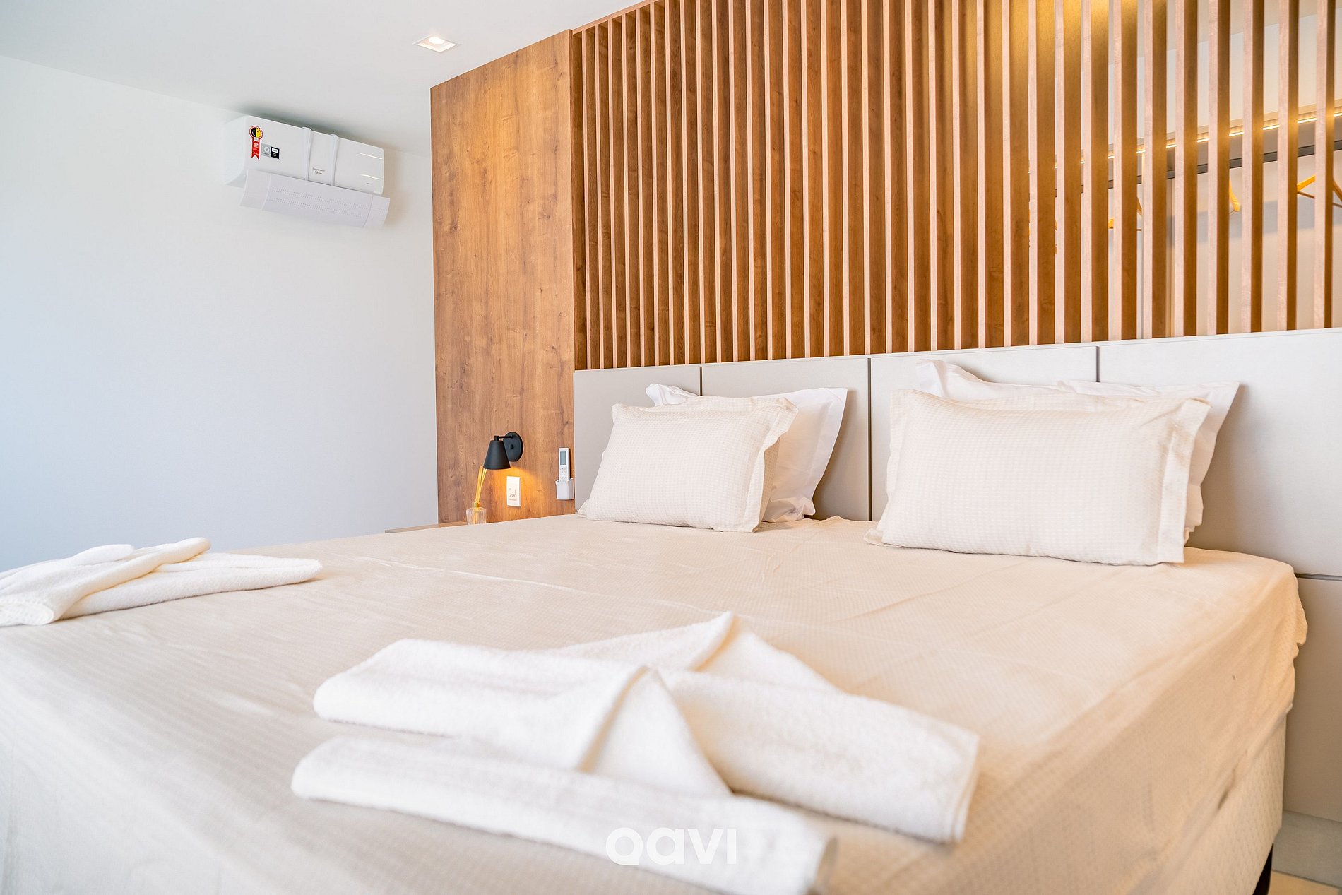 Suíte 1: cama de casal queen + colchão solteiro suporte, ar-condicionado, armário e banheiro completo.