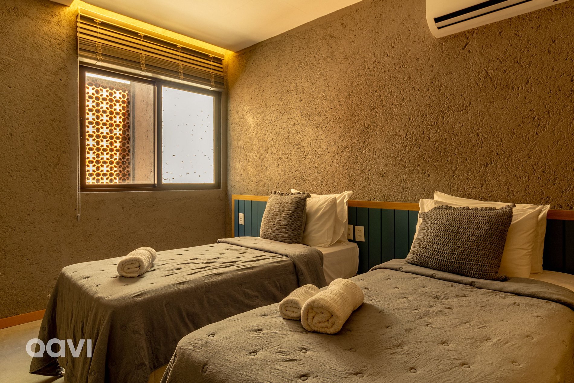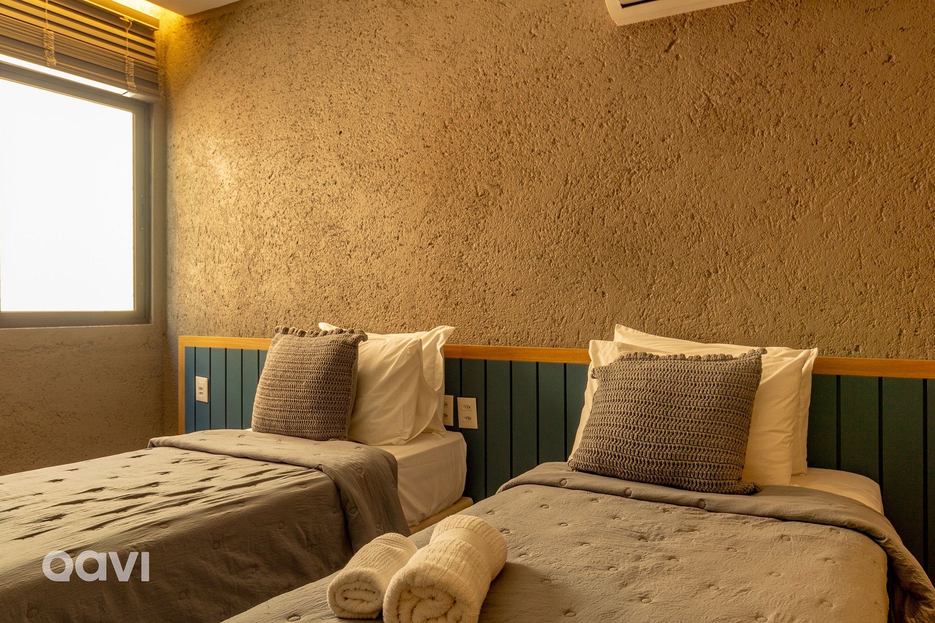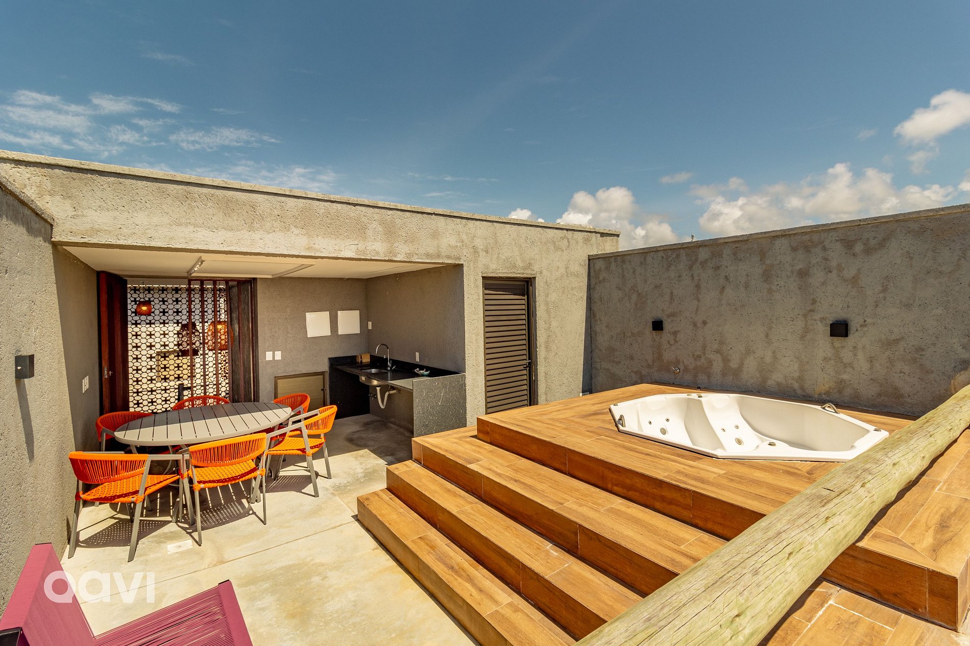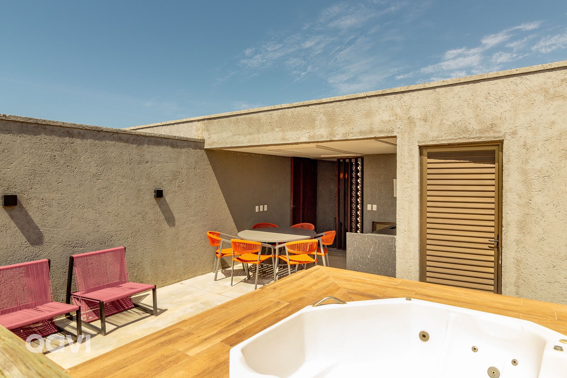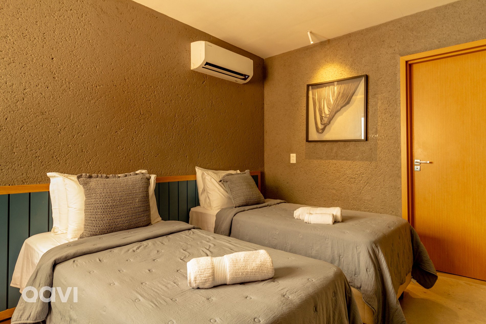 A unidade se dispõe em: • Sala de estar e jantar: smart-TV, sofá, poltrona de madeira, rack, mesa com 6 lugares; • Banheiro térreo: com chuveiro, ducha higiênica e utensílios básicos de banheiro. • Cozinha: utensílios completos (talheres, xícaras, panelas, pratos e copos), geladeira, cafeteira, sanduicheira, liquidificador, aparelhos de servir e armários. • Área de lazer: piscina, cadeiras, churrasqueira, divãs e redes; • Suíte principal: cama de casal + 1 solteiro auxiliar, ar-condicionado, televisão smart tv, espelho de corpo inteiro, aparelhos decorativos e banheiro com utensílios básicos; • Suíte 2: duas camas de solteiro + 2 solteiro auxiliar, itens decorativos, televisão smart tv, espelho de corpo inteiro, ar-condicionado e banheiro com utensílios básicos; • Suíte 3: cama de casal + 1 solteiro auxiliar, ar-condicionado, espelho de corpo inteiro, armário, televisão smart tv, itens decorativos e banheiro com utensílios básicos; • Rooftop: banheira de hidromassagem, mesa com 6 lugares, televisão (smart tv), grill de churrasco, cervejeira e utensílios básicos de servir; • 1 vaga de garagem;