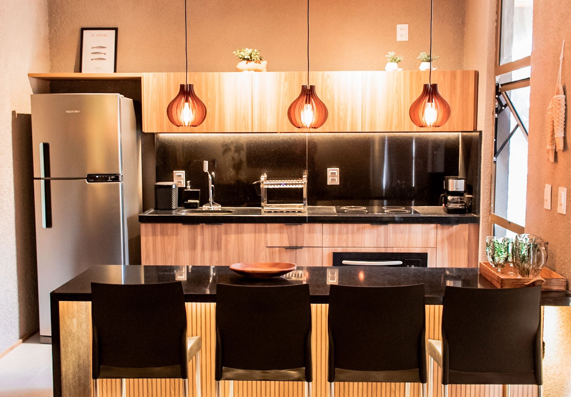 • Cozinha equipada com máquina de café Nespresso e em pó,forno elétrico, fogão coocktop de indução, cooler de 26 litros, airfryer e geladeira;