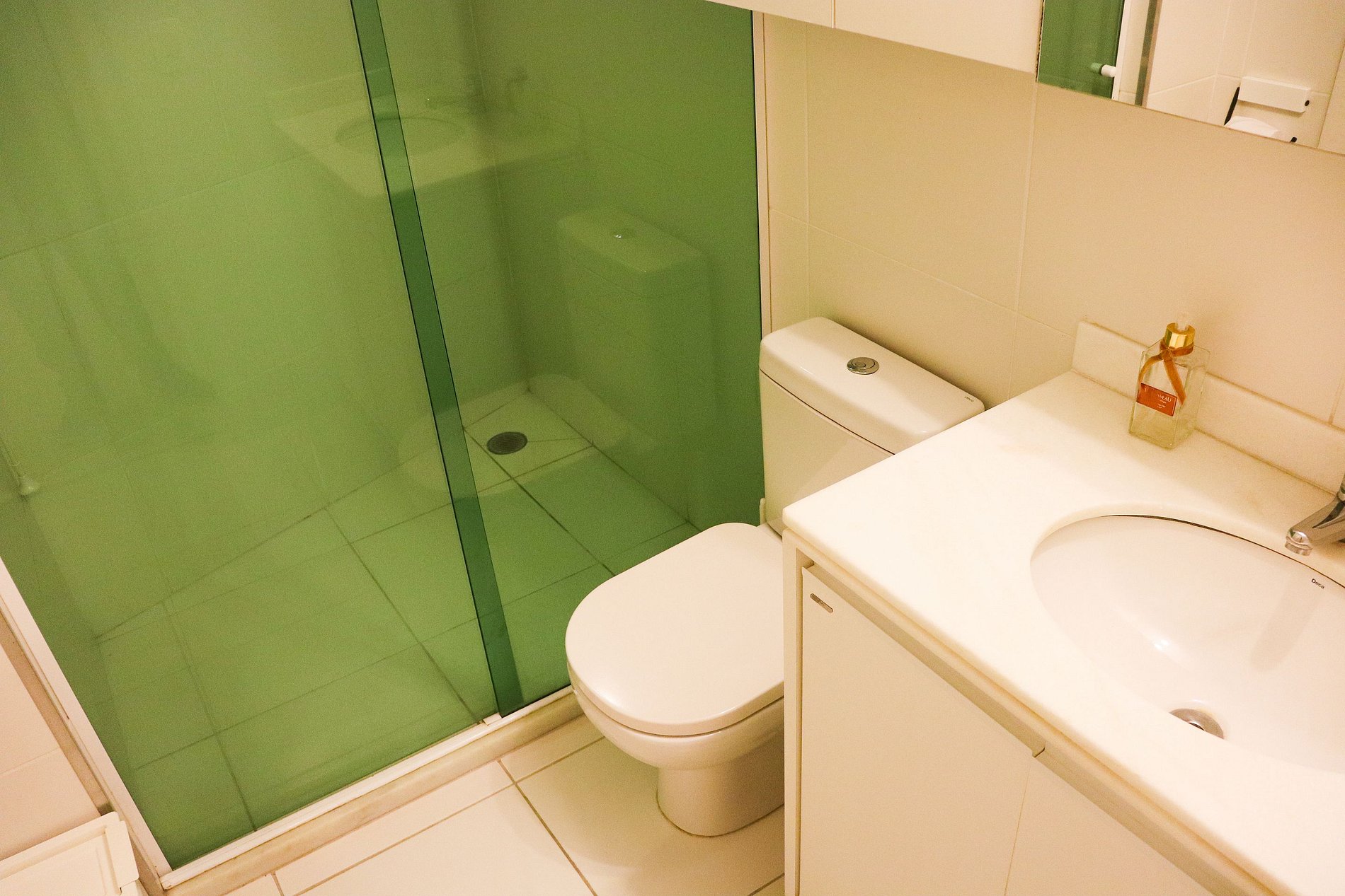 Com chuveiro quente, espelho amplo e bom espaço de circulação.