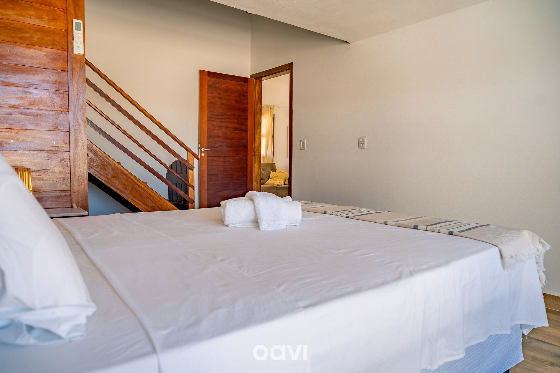 - Suíte 1 (mezanino): Pavimento superior: 1 cama de casal e ar-condicionado portátil;