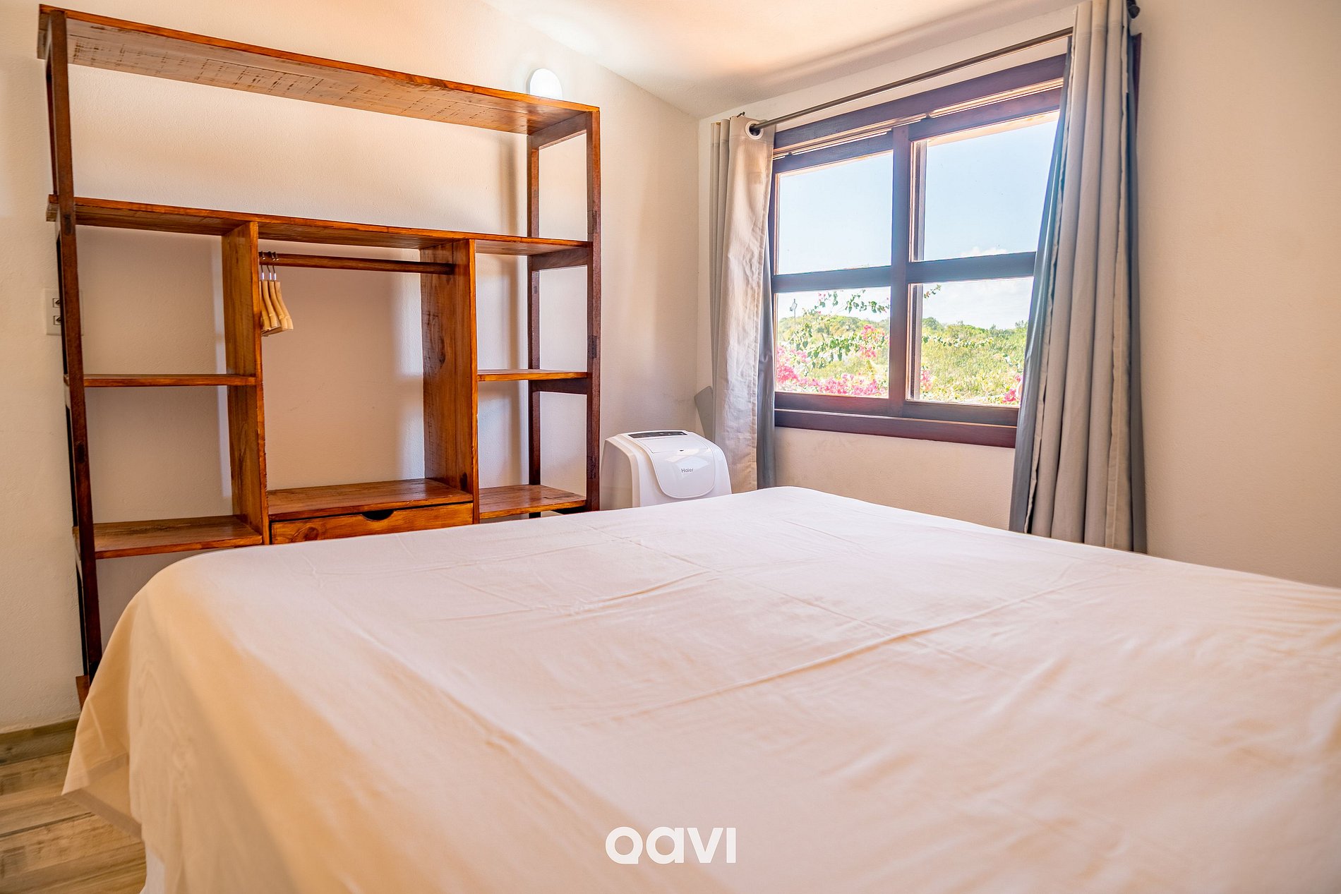 Quarto independente, com cama de casal, ar-condicionado, mesas de cabeceira e guarda-roupas;