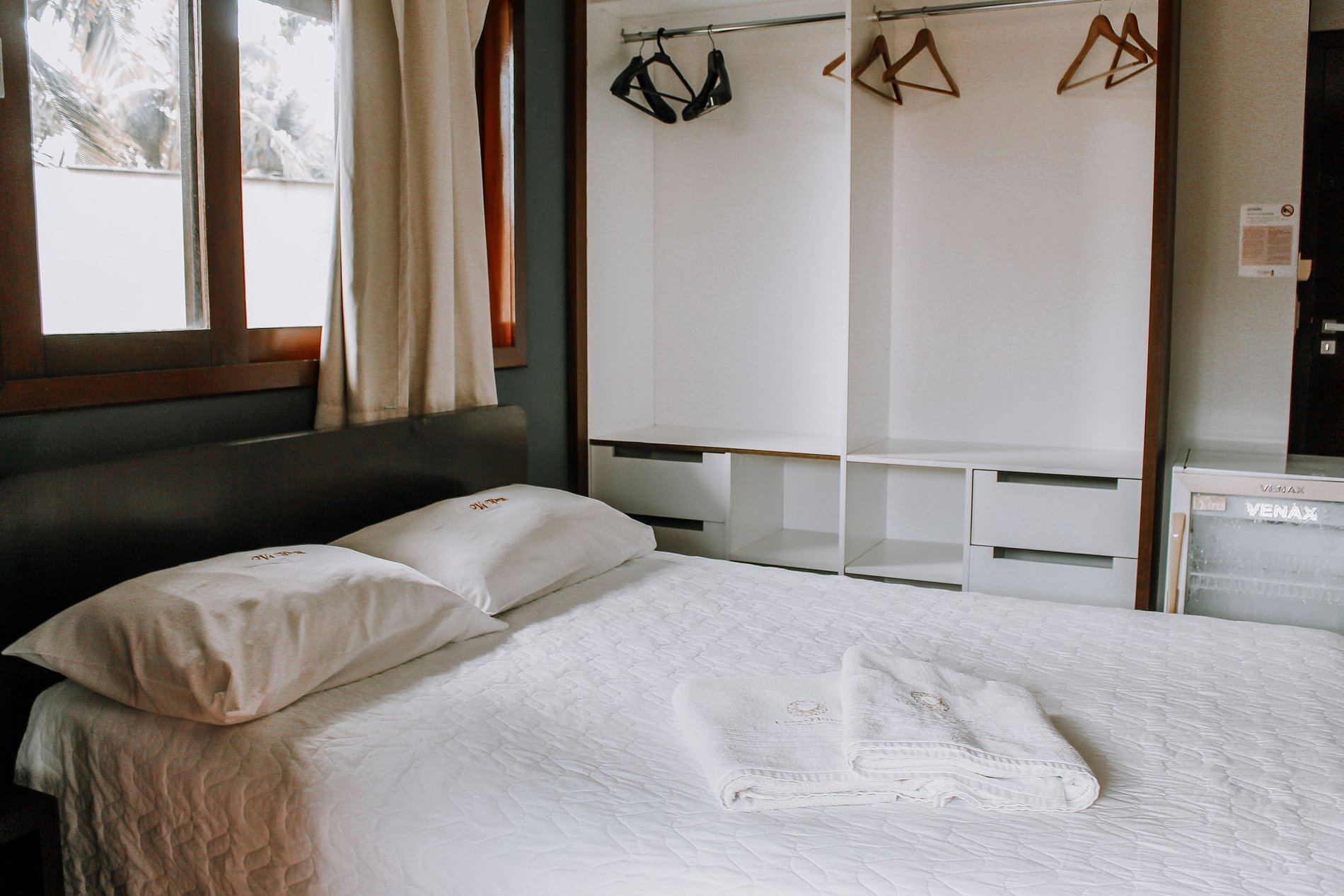 A acomodação possui TV, Wifi gratuito, ar - condicionado, cama de casal, mesinha de cabeceira, armário e um banheiro.