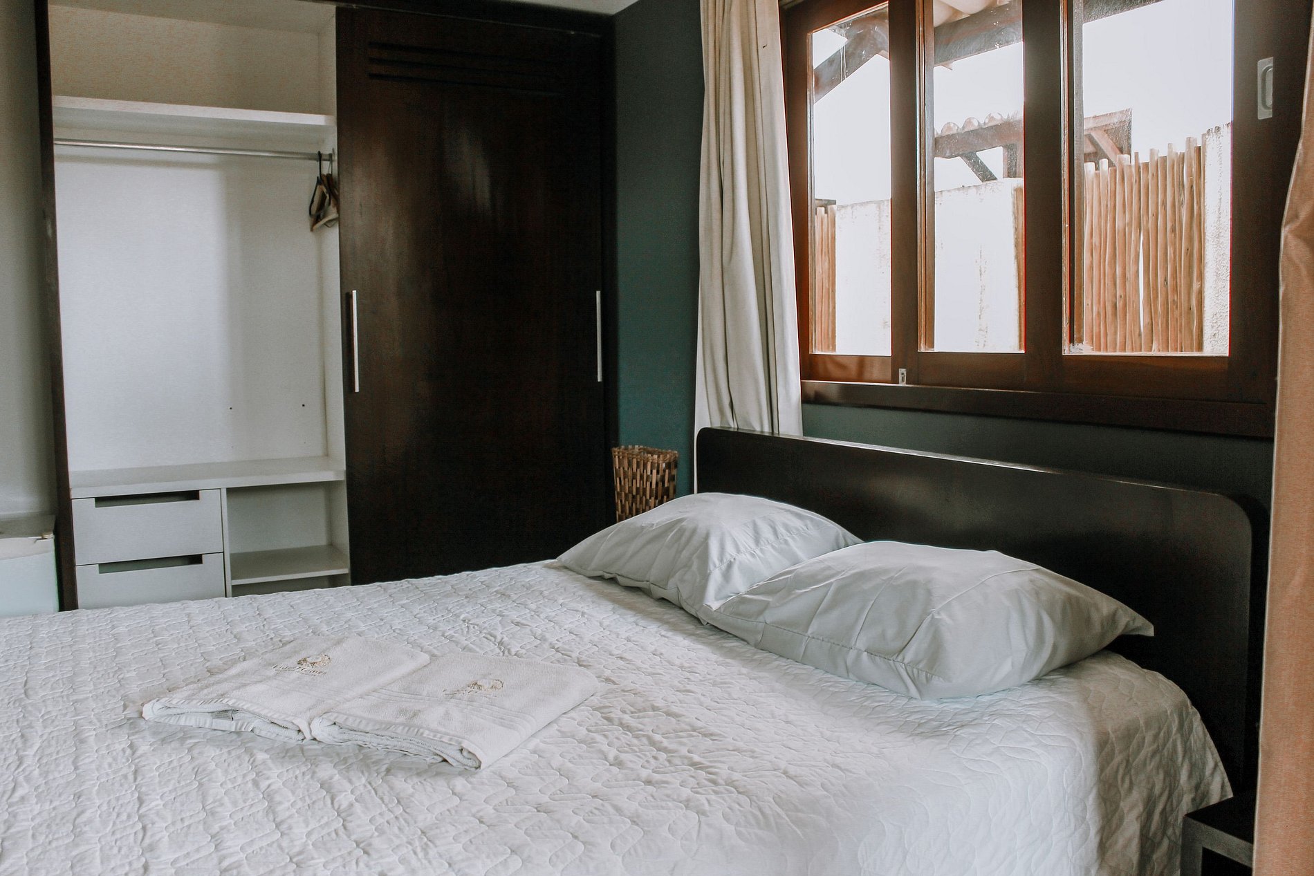 A acomodação possui TV, Wi-fi gratuito, ar - condicionado, cama de casal, mesinha de cabeceira, armário.