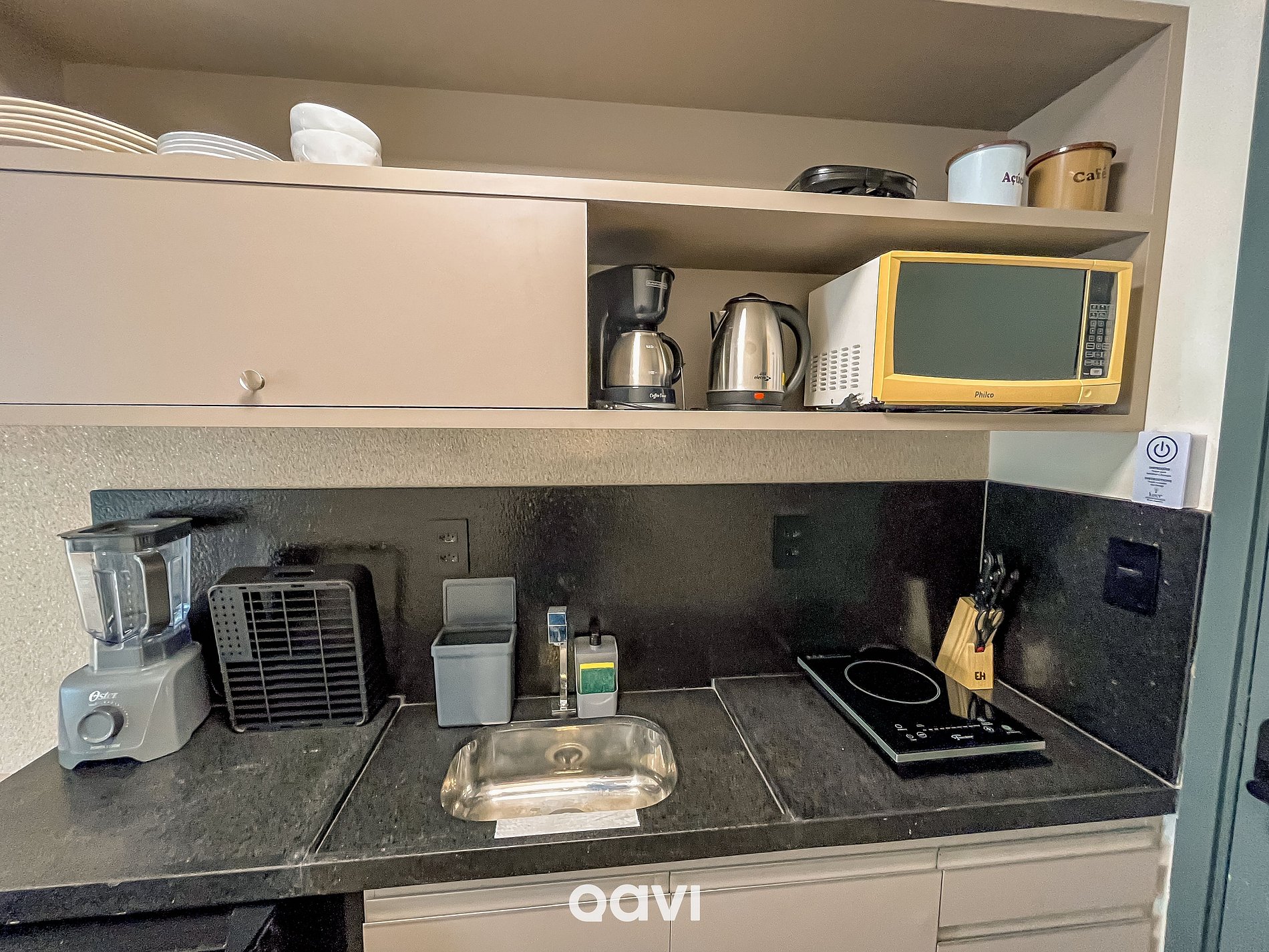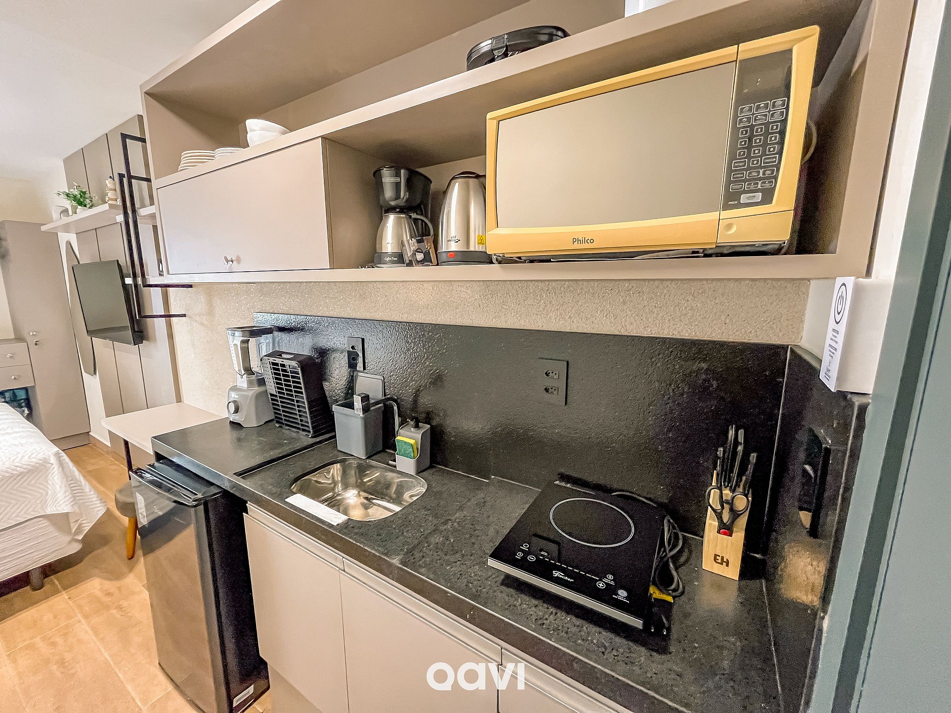 Cozinha: equipada com frigobar, microondas, cafeteira elétrica, liquidificador, sanduicheira e utensílios básicos (panelas, copos, taças e talheres).