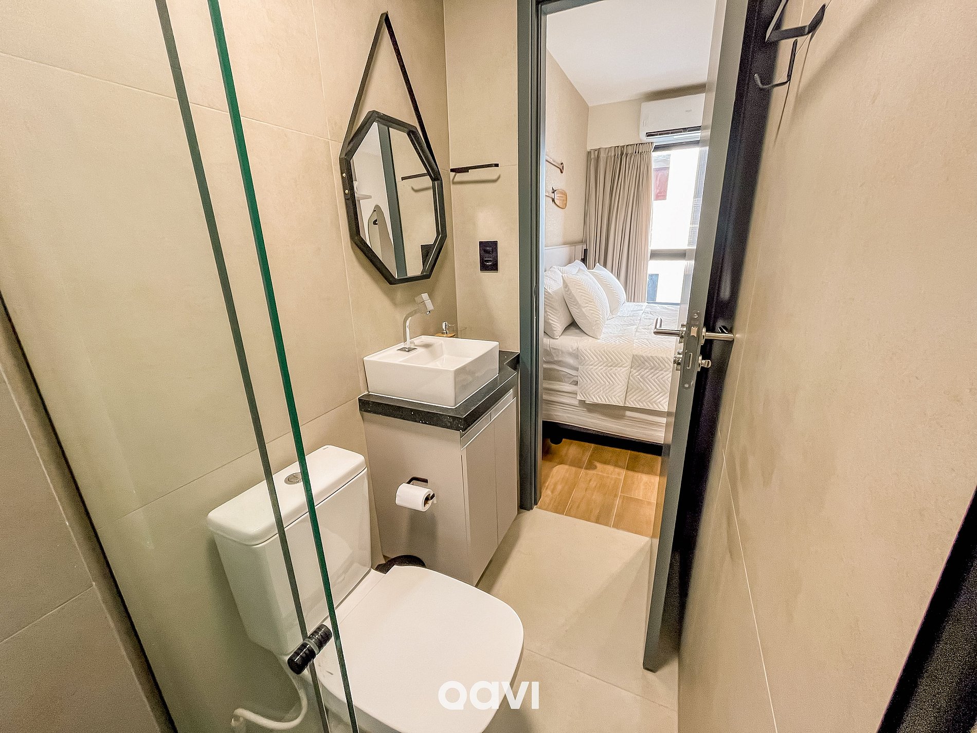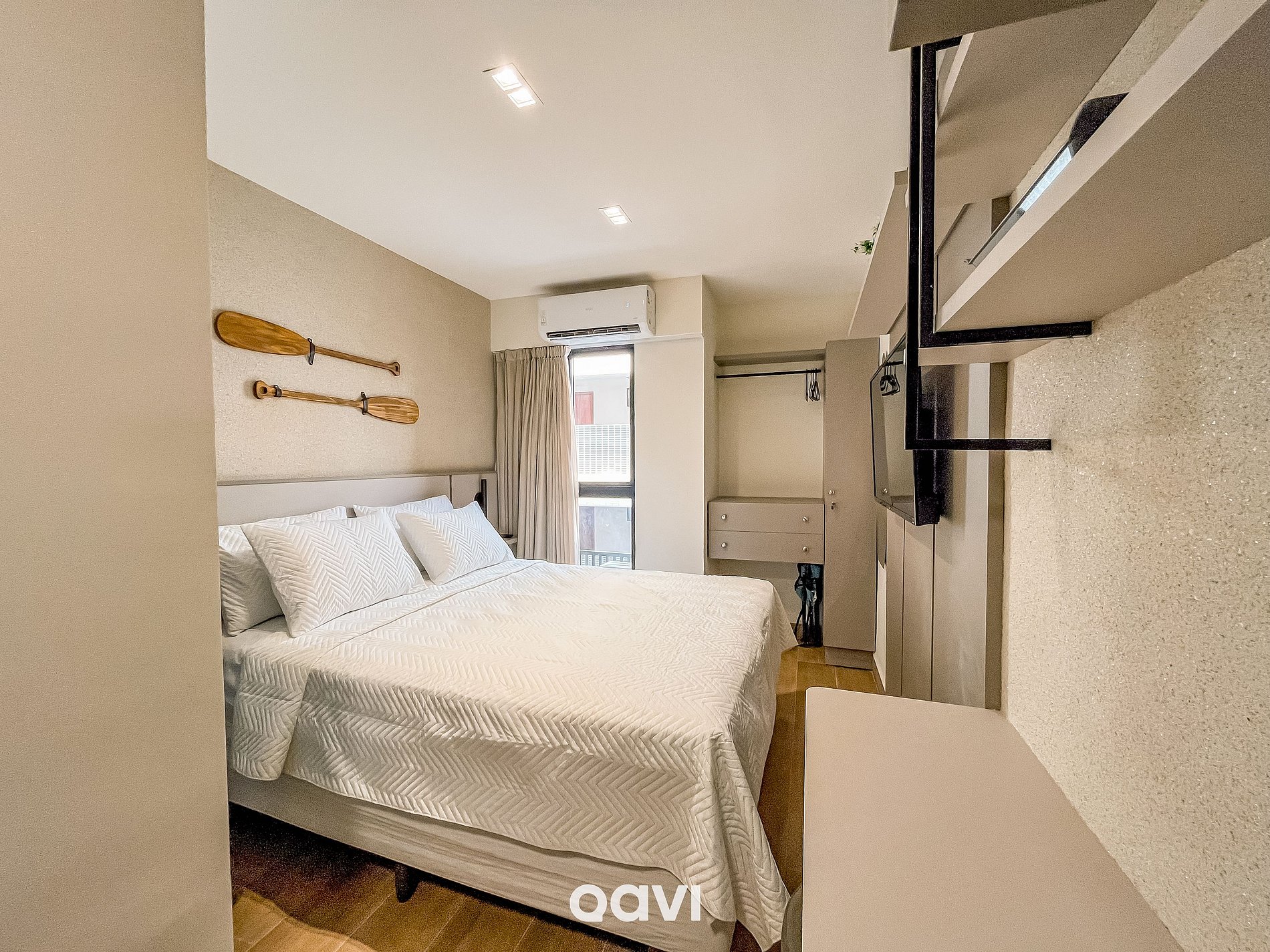 Suíte: 01 cama queen, TV, ar-condicionado, armário com cabides e banheiro completo.