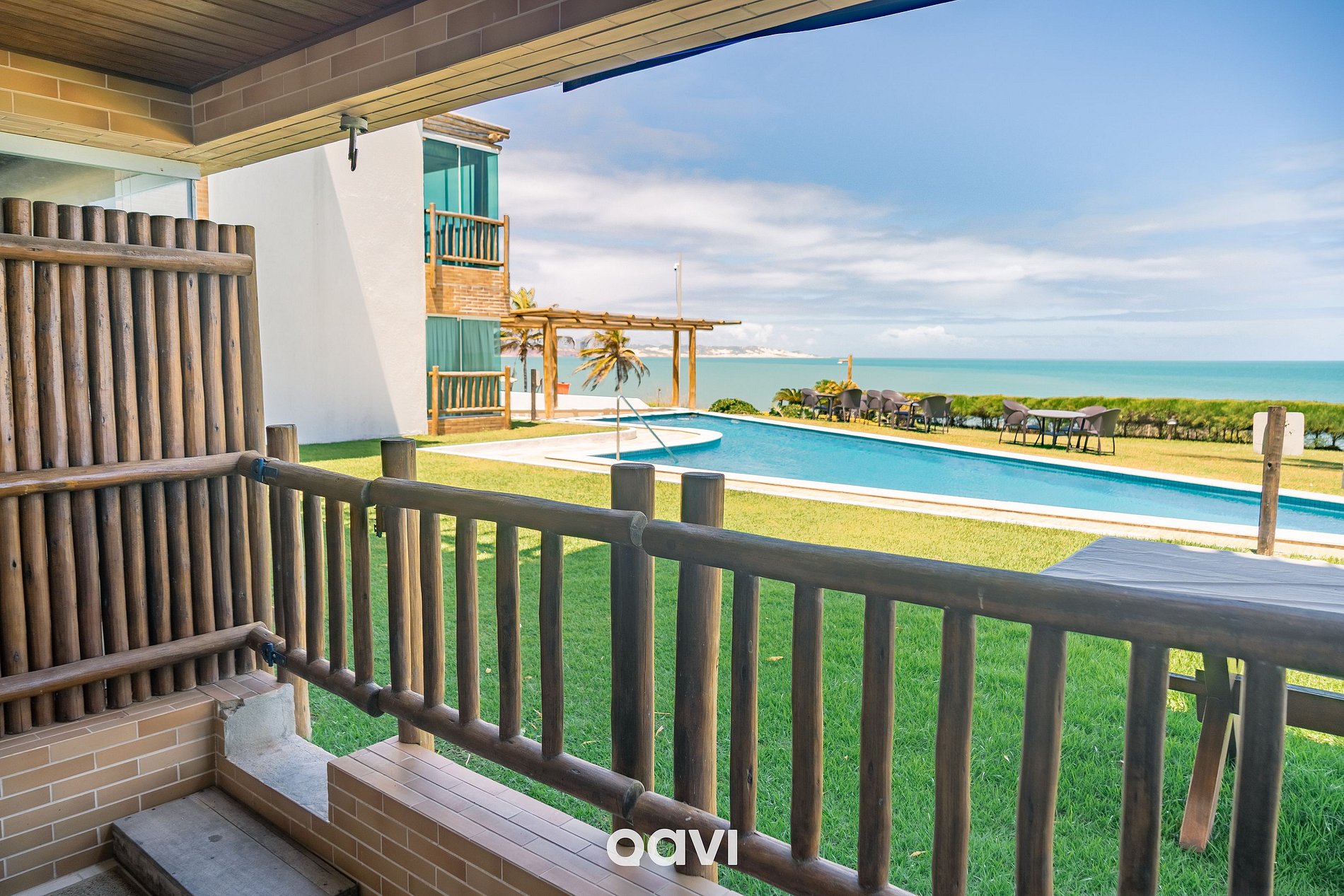 Varanda: ampla, com espaço para rede de descanso, vista para a piscina panorâmica e para a Praia de Pirangi do Norte, perfeita para relaxar.