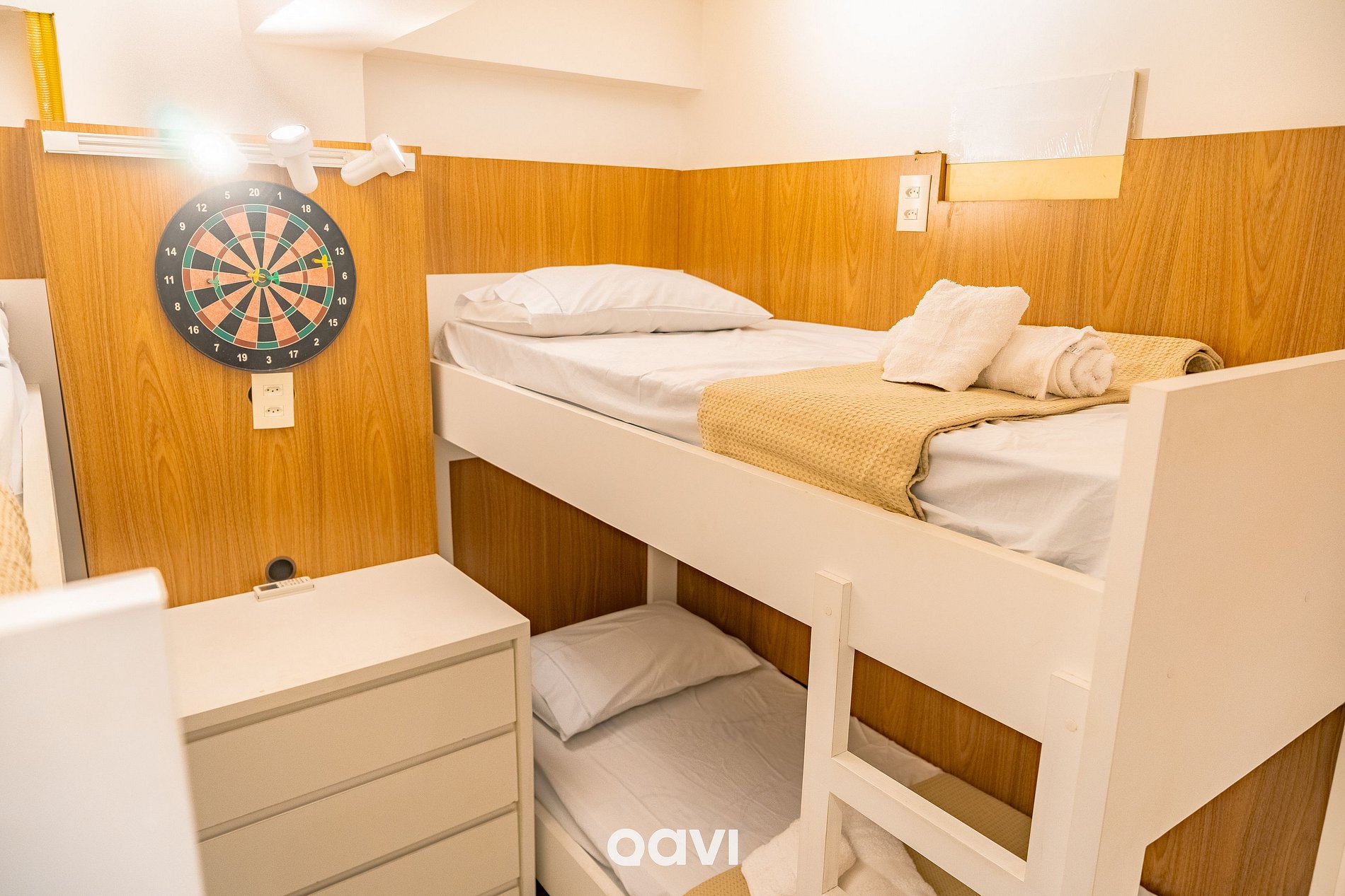 Quarto 4: duas beliches (4 camas de solteiro) com grades de proteção para crianças, ar-condicionado e armário.