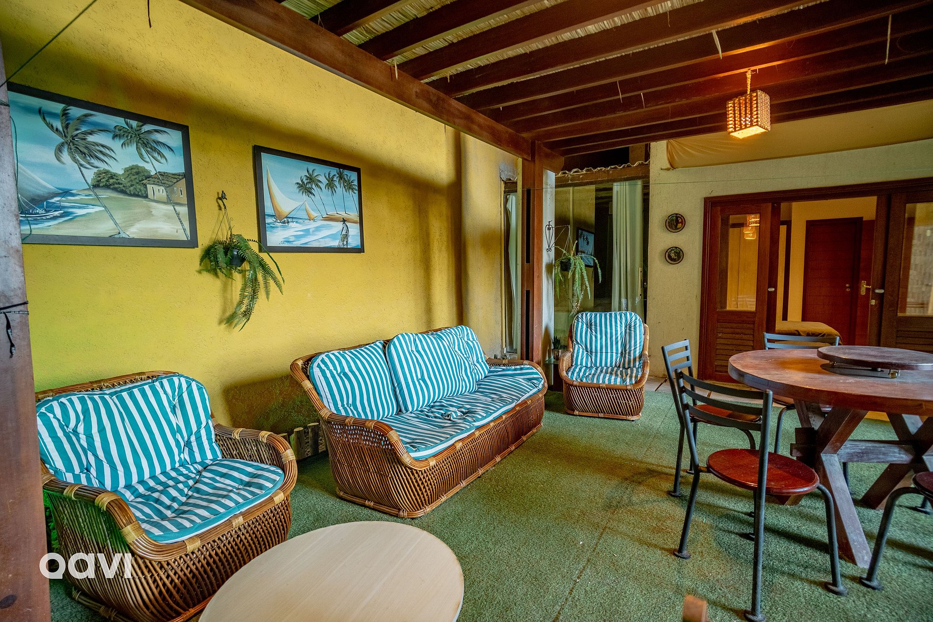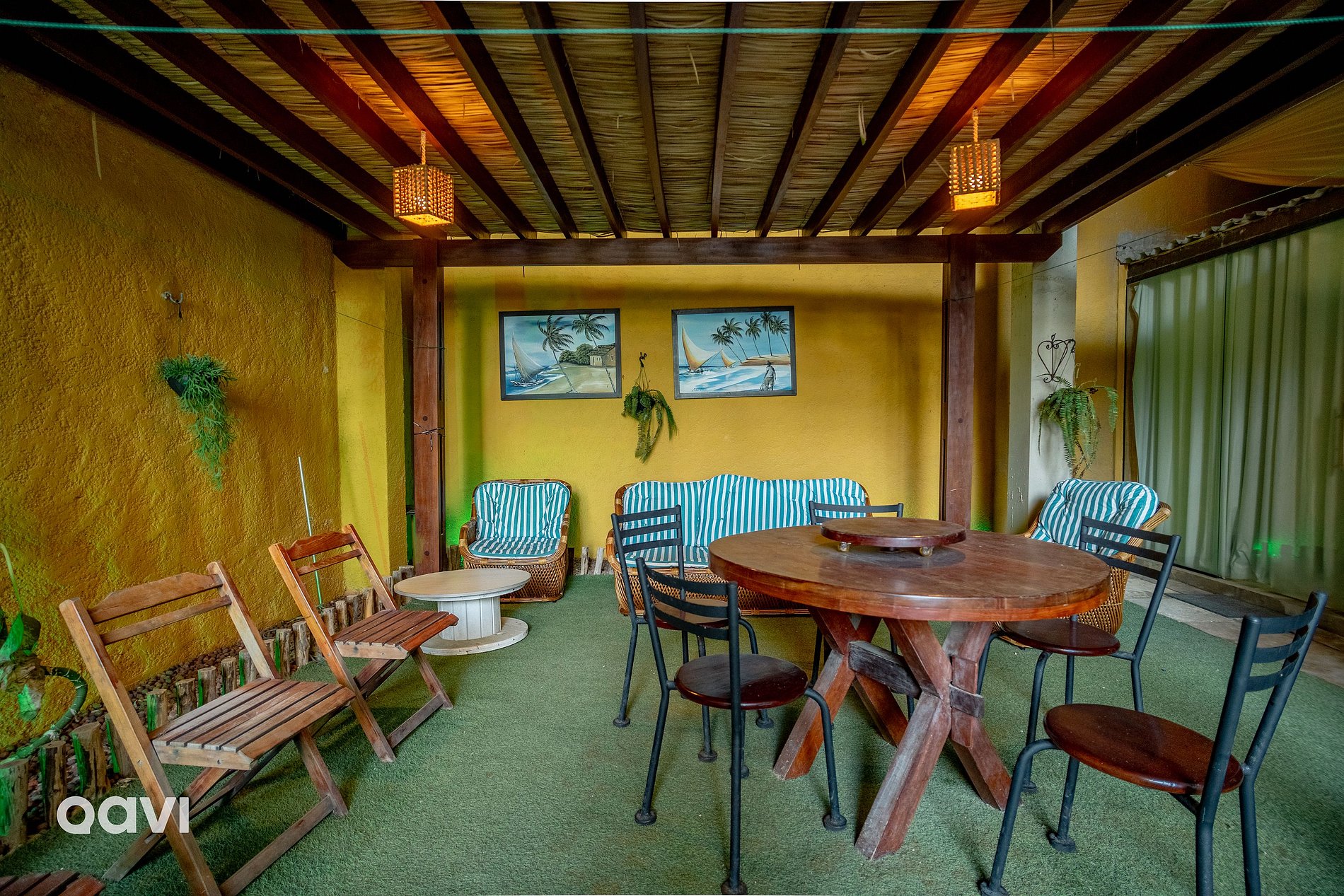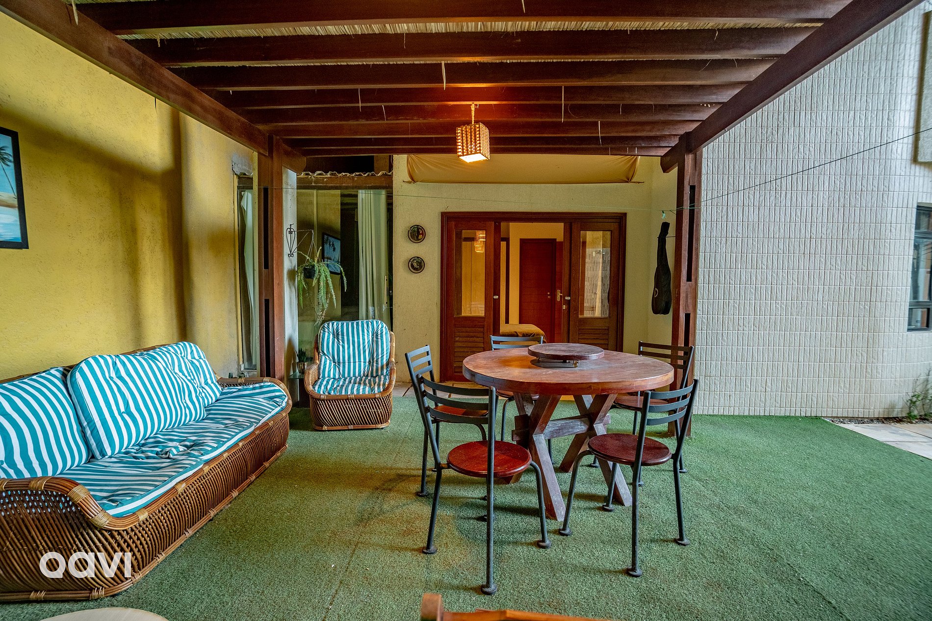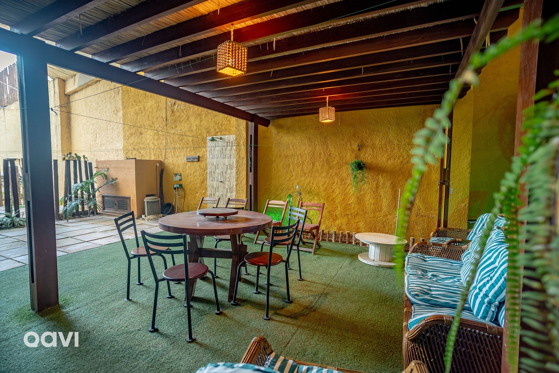- Área externa privativa: Uma mesa com seis cadeiras, sofás e toda uma área verde com chuveirão e espaço suficiente para curtir os dias em Natal.